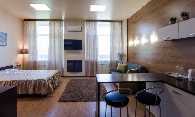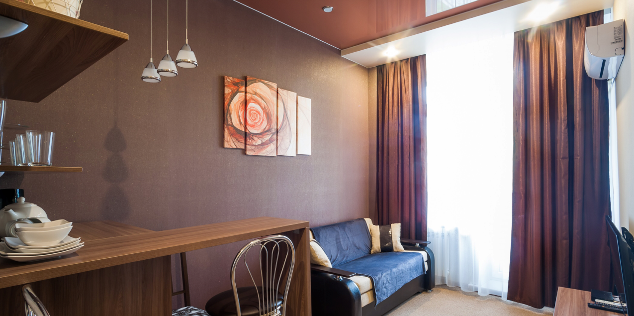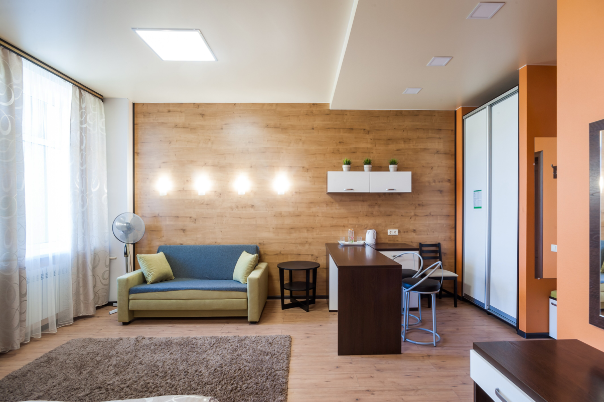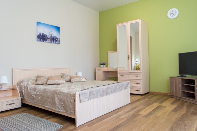 В номере: двуспальная кровать, диван, гардероб, кресло, 2 прикроватных тумбы, стол, стул, телевизор, холодильник, чайник, набор посуды, WI-FI.
