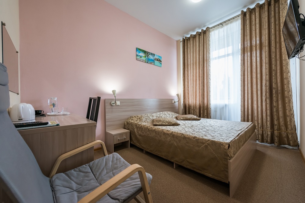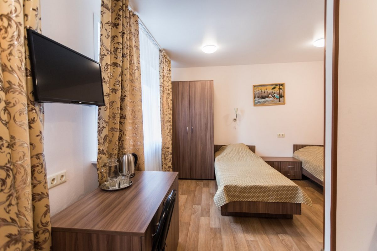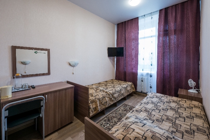 Оснащение комнаты: двуспальная кровать или две односпальных кровати, две прикроватные тумбочки, стол, стул, телевизор, холодильник, чайник, набор посуды, WI-FI.