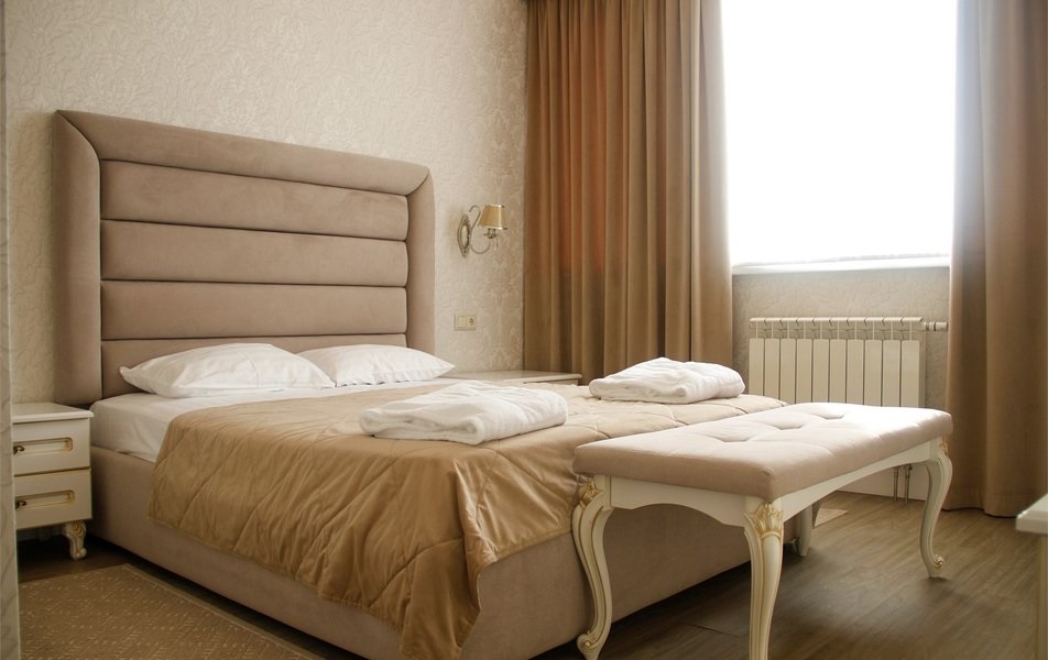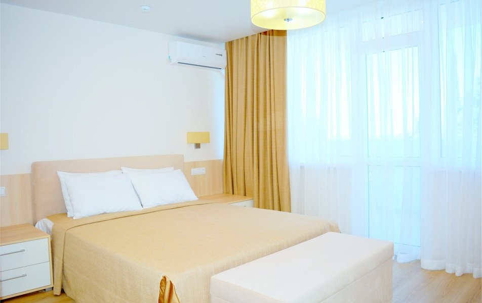 В номере: диван, кровать двуспальная, прикроватные тумбочки, стул, шкаф, кондиционер, мини-холодильник, телевизор, телефон, чайный набор посуды, электрочайник
