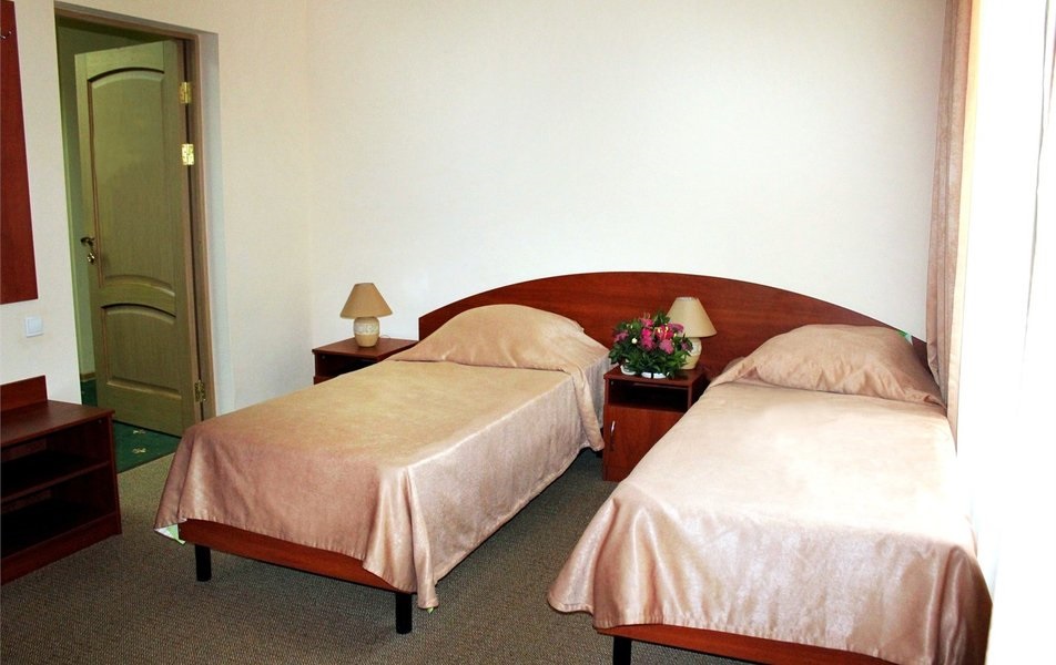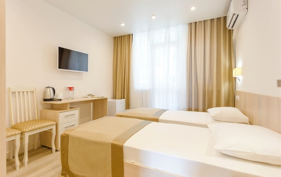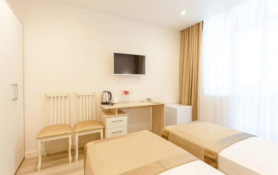 В номере: кровати односпальные, прикроватные тумбочки, стол, стулья, шкаф, кондиционер, мини-холодильник, телевизор, телефон, чайный набор посуды, электрочайник