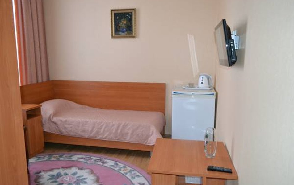 В номере: зеркало, кровать односпальная, прикроватные тумбочки, стол, стул, шкаф, мини-холодильник, телевизор