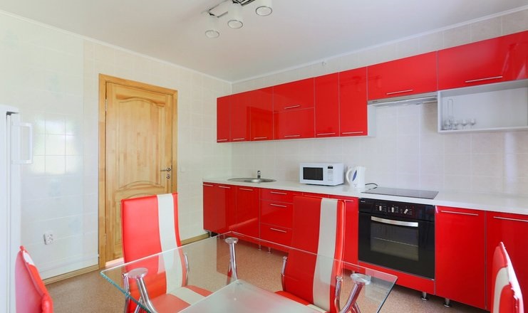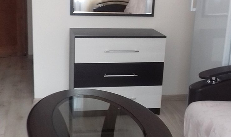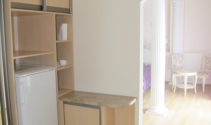 В номере: две комнаты: спальня и гостиная с кухней, двуспальная кровать, прикроватные тумбочки, стол, стулья, шкаф-купе, шкаф для посуды, набор мягкой мебели, журнальный столик, набор посуды, телевизор ЖК, холодильник