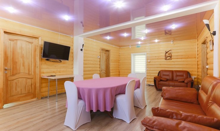 В коттедже: две комнаты: спальня и гостиная с кухней, двуспальная кровать, прикроватные тумбочки, стол, стулья, шкаф-купе, шкаф для посуды, набор мягкой мебели, мини-кухня, набор посуды, телевизор ЖК, холодильник, электрическая плита