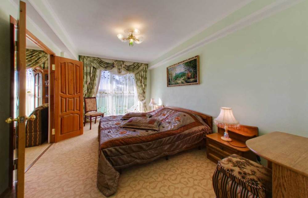 В номере: две комнаты: спальня и гостиная, двуспальная кровать, прикроватные тумбы, посудный шкаф, стол, стулья, комод, пуф, мягкая мебель, шкаф/гардероб, мини-холодильник, телевизор, телефон, кондиционер