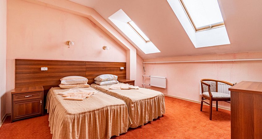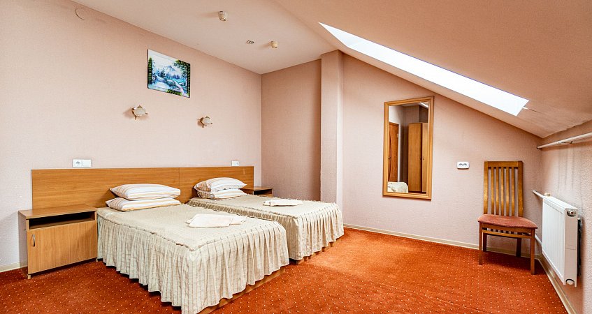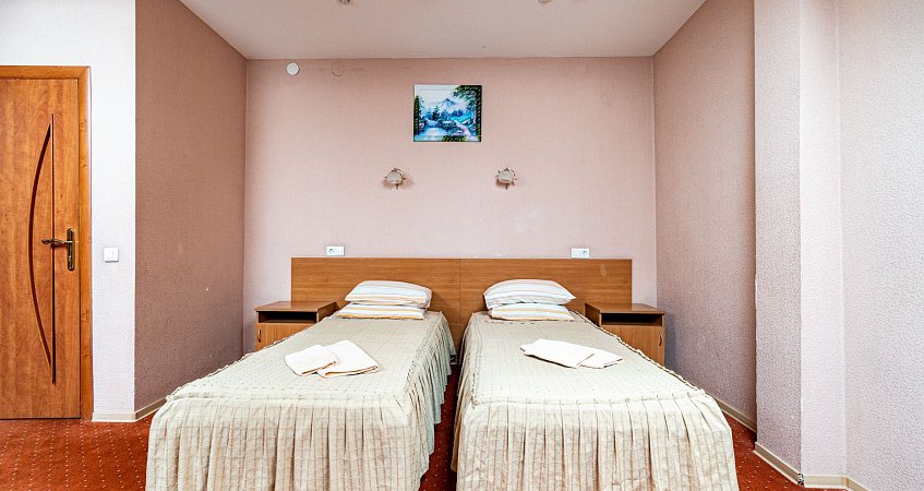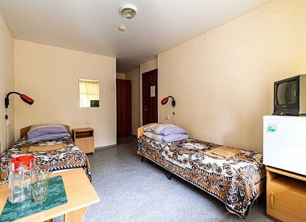 В номере: две полутороспальные кровати, шкаф, телевизор, холодильник, Wi-FI, зеркало, тумба