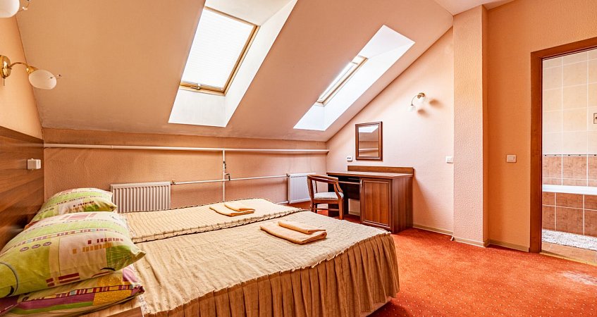 В номере: телевизор, холодильник, Wi-Fi, интернет, две полутороспальные кровати, двуспальная кровать, кресла, вешалки, шкаф для одежды, тумбы, стулья