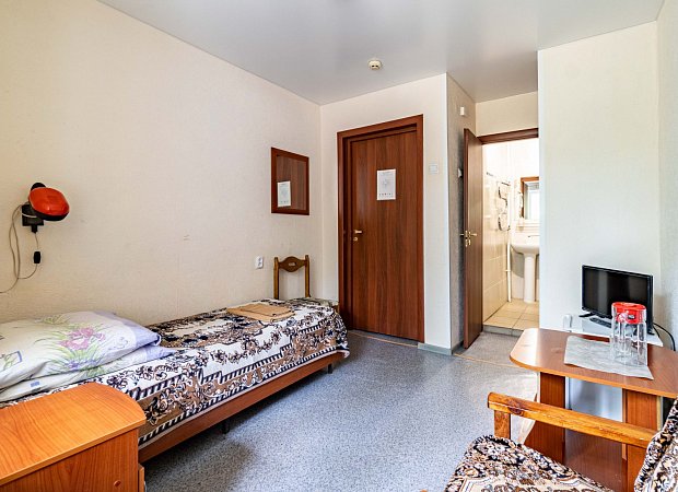 В номере: одна полутороспальная кровать, тумбочка, телевизор, шкаф, холодильник, Wi-Fi