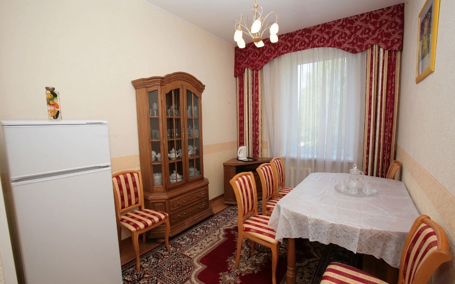 В номере: душ, туалет, ТВ, холодильник, электрочайник, двуспальная кровать. - 2-х местный 3-х комнатный номер люкс.