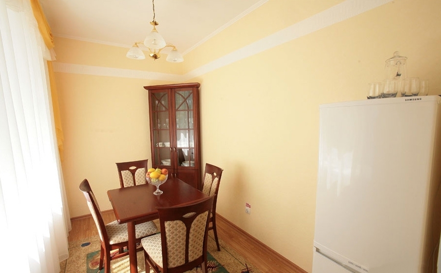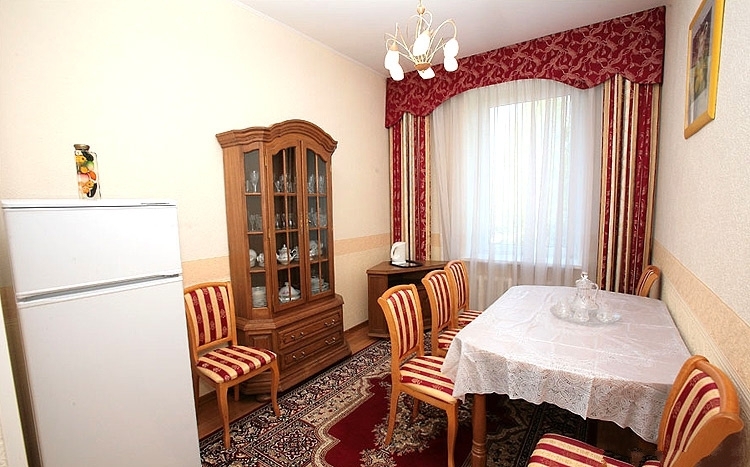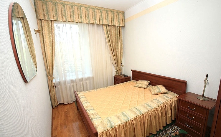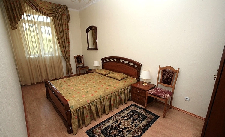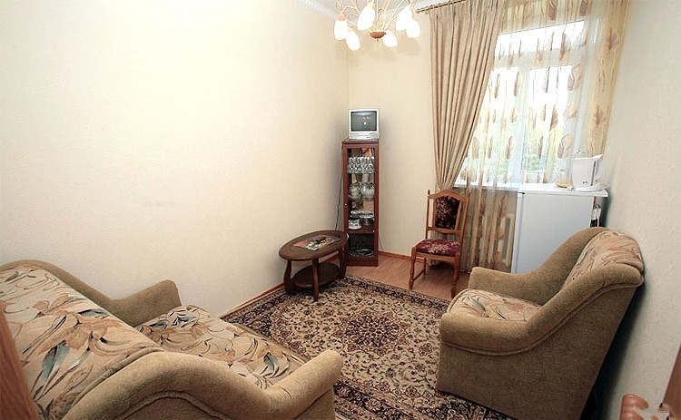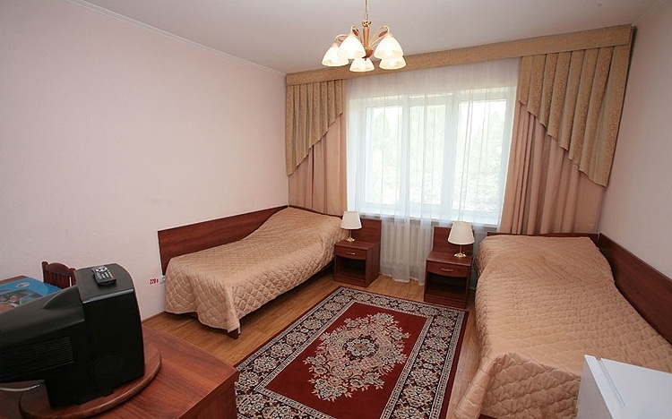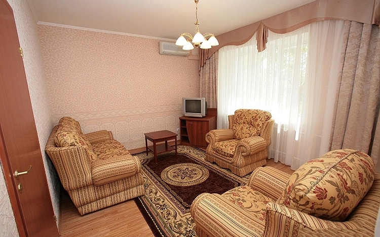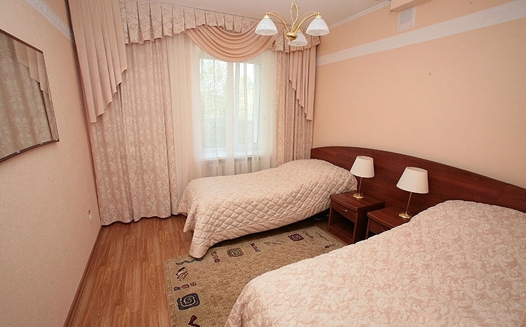 В номере: 2-спальная кровать, прикроватные тумбочки, бра, туалетный столик с зеркалом, платяной шкаф, корпусная и мягкая мебель, TВ, журнальный и обеденный столы, набор столовой и чайной посуды, холодильник, электрочайник, печь СВЧ.