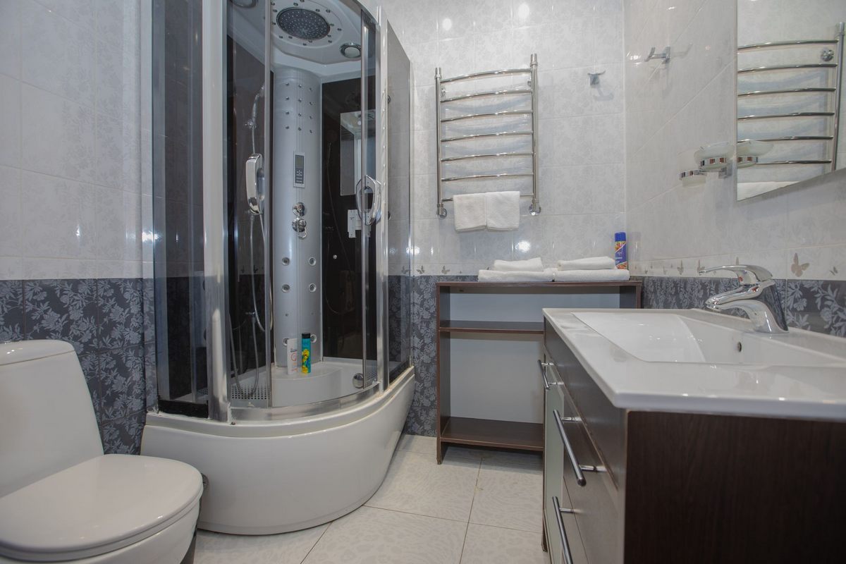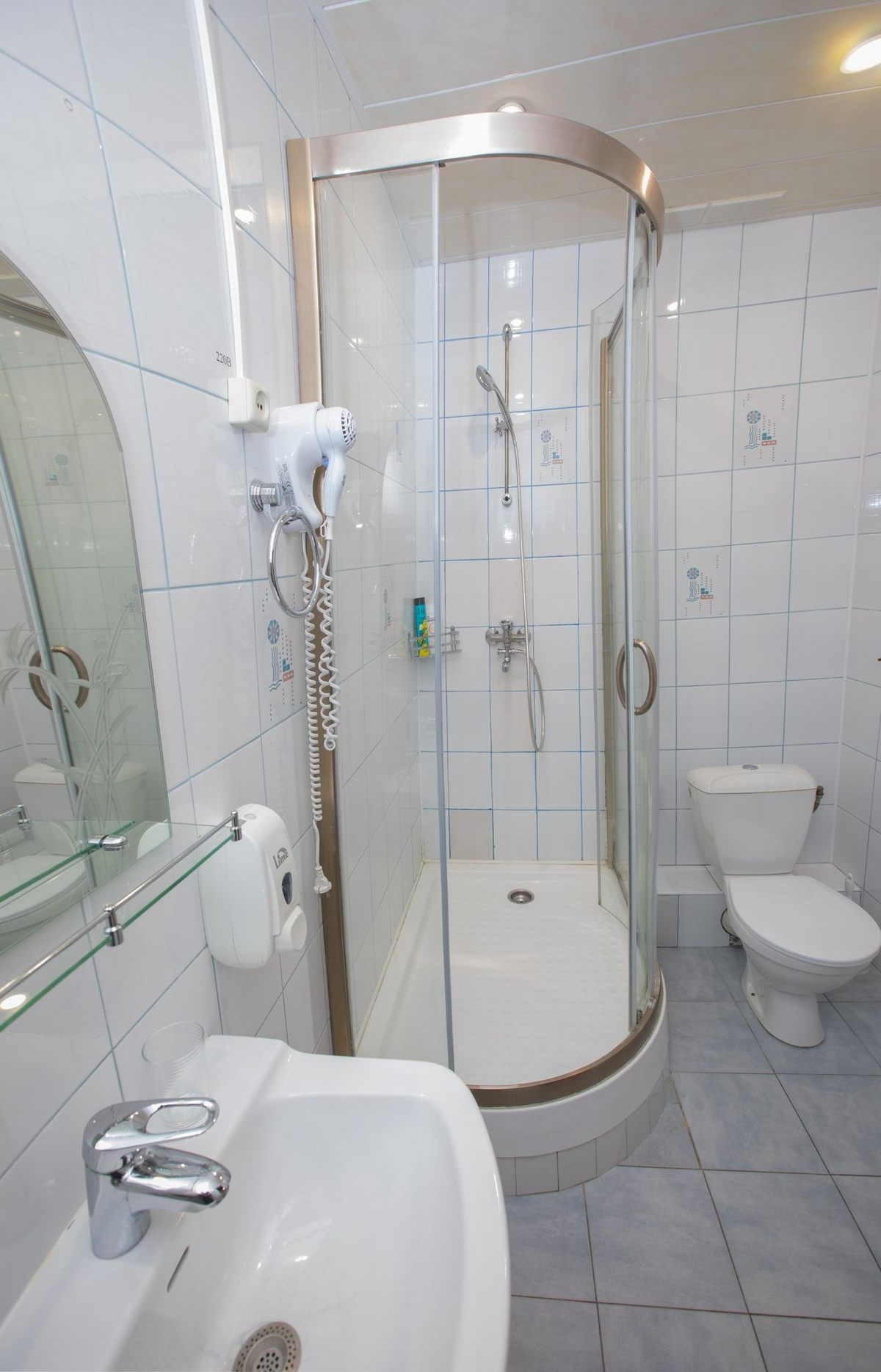 Сан/узел: душевая кабина, раковина, унитаз, гигиенические принадлежности, тапочки, халат, полотенца, фен