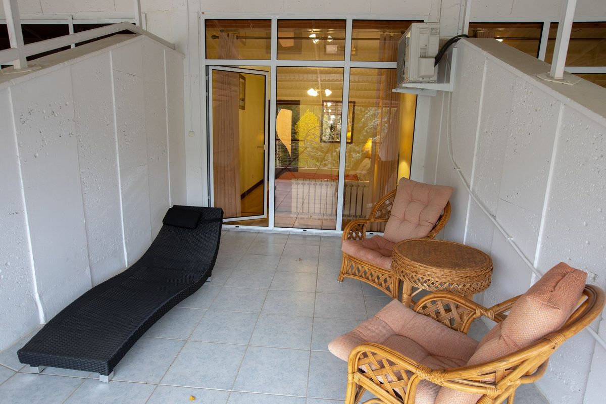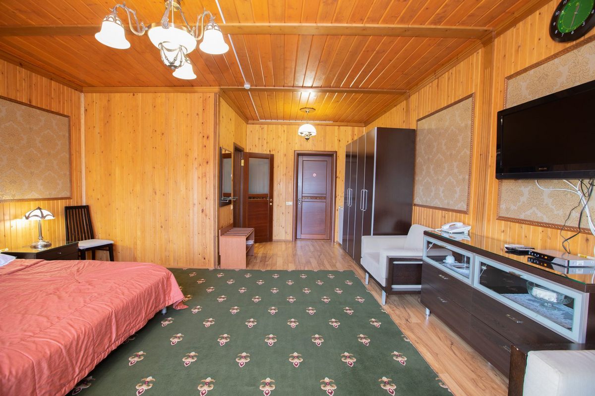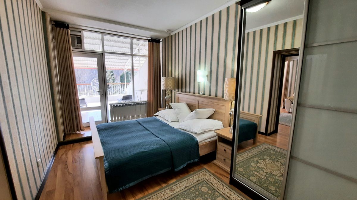 Оснащение номера: двуспальная кровать, прикроватные тумбочки, стулья, стол, шкаф для одежды, диван, телевизор, холодильник, кондиционер, сейф, чайная пара, сушилка для белья