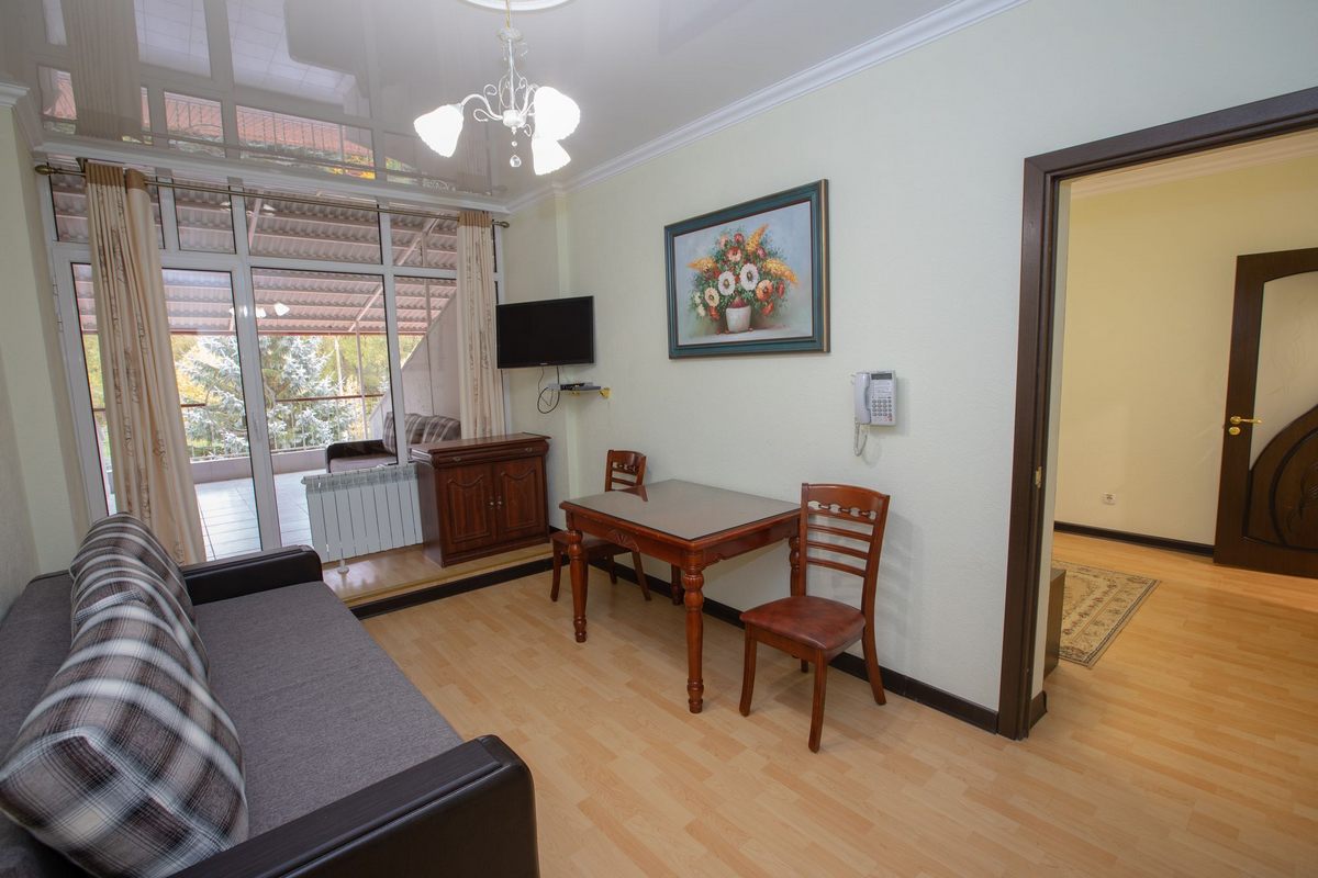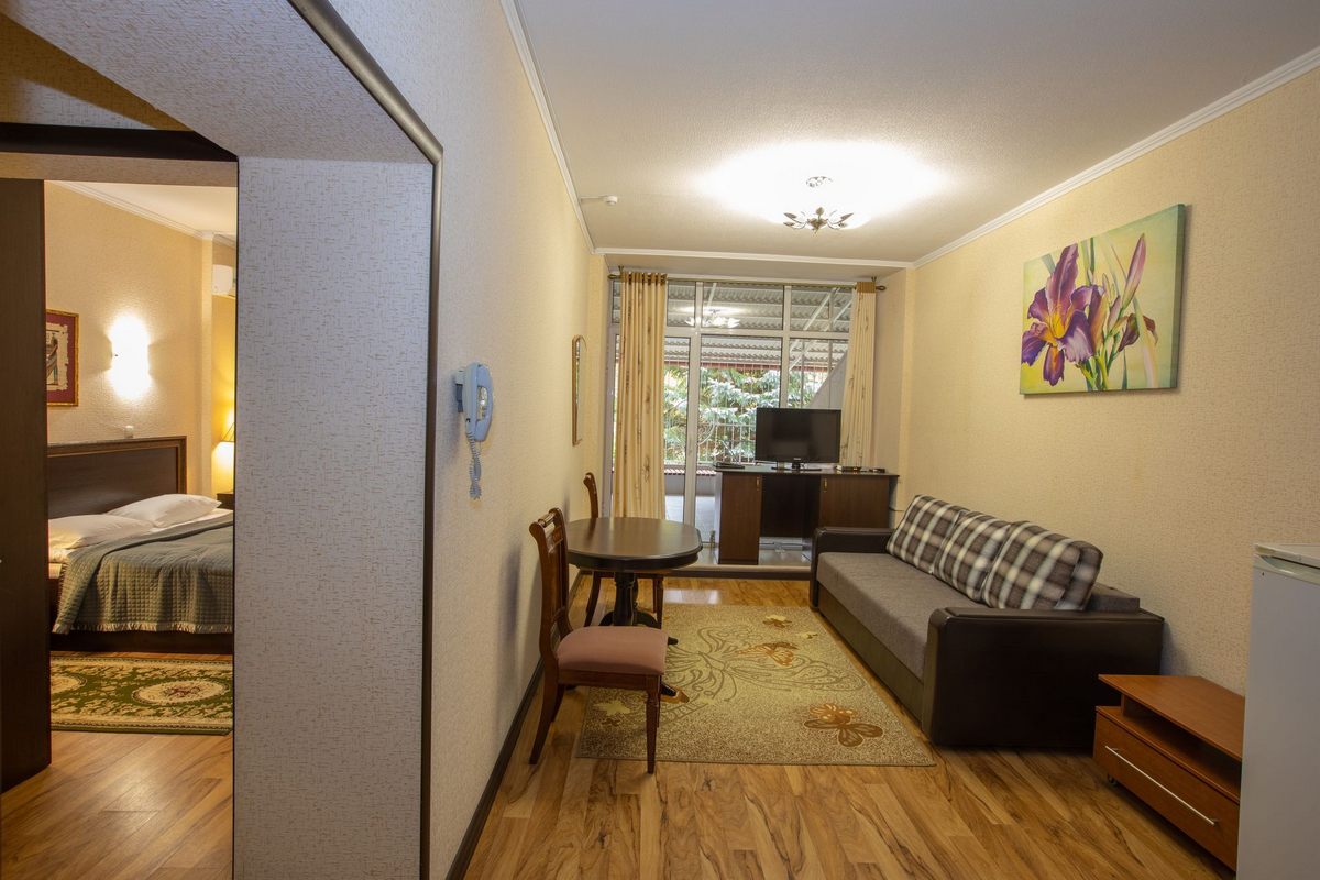 Оснащение номера: спальня и гостиная, двуспальная кровать, прикроватные тумбочки, стол, стулья, шкаф для одежды, диван, столик журнальный, обеденный гарнитур, телевизор, холодильник, кондиционер, сейф, чайная пара, сушилка для белья