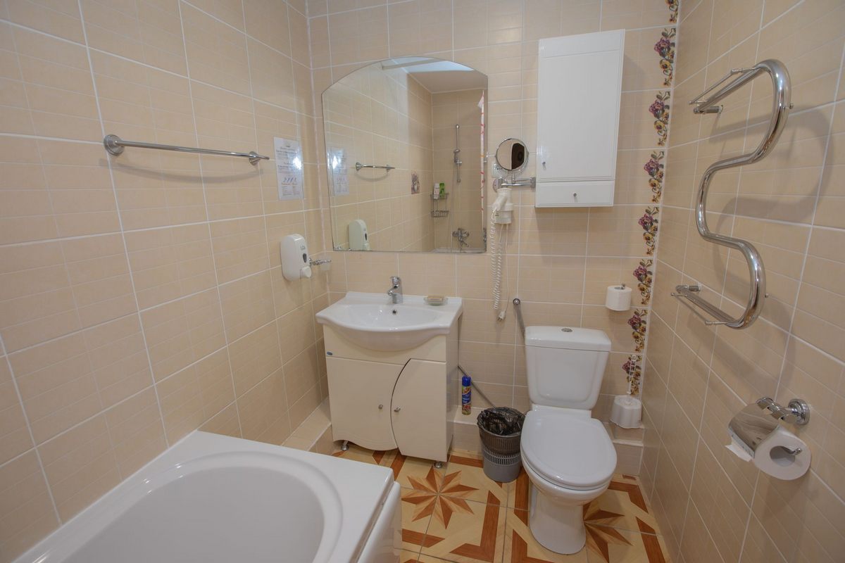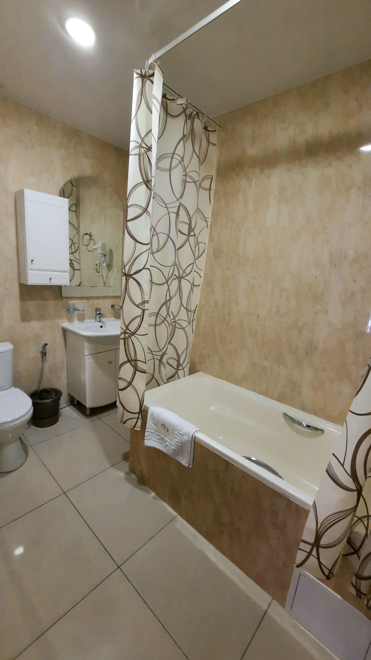 Сан/узел: ванна, раковина, унитаз, гигиенические принадлежности, тапочки, халат, фен, полотенца