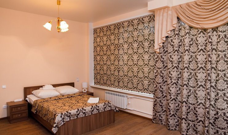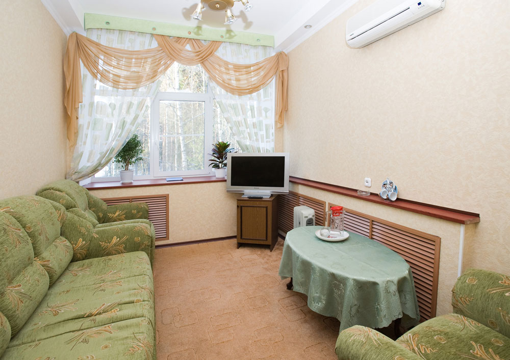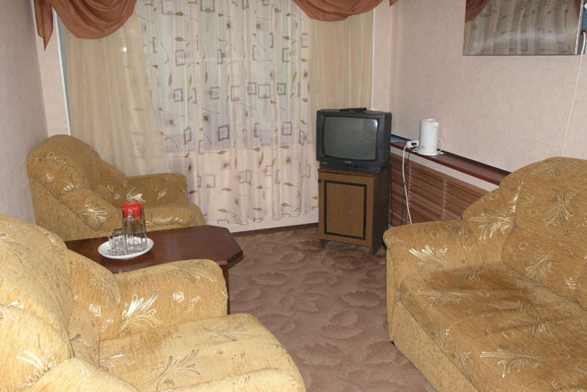 В номере: диван раскладной, кровать двуспальная, прикроватные тумбочки, столик журнальный, шкаф-купе, мини-холодильник, набор посуды, телевизор ЖК, чайный набор посуды, электрочайник