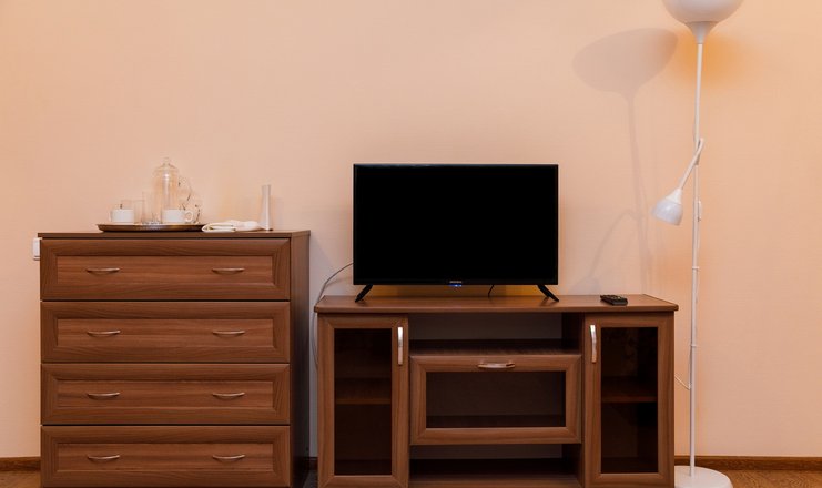 В номере: вешалка, диван, зеркало, комод, кровать двуспальная, прикроватные тумбочки, столик журнальный, шкаф-купе, шкаф для посуды, мини-холодильник, телевизор, чайный набор посуды, электрочайник