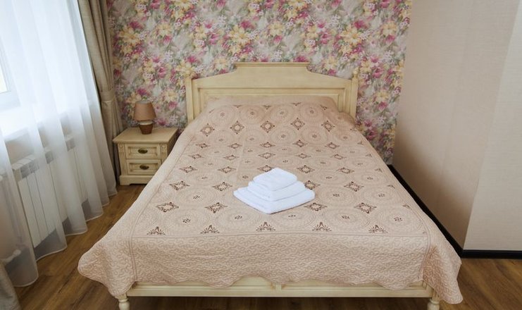 В номере: вешалка, диван раскладной, зеркало, комод, кровать двуспальная, прикроватные тумбочки, стол, столик журнальный, стул, шкаф-купе, шкаф для посуды, мини-холодильник, набор посуды, телевизор ЖК, чайный набор посуды, электрочайник