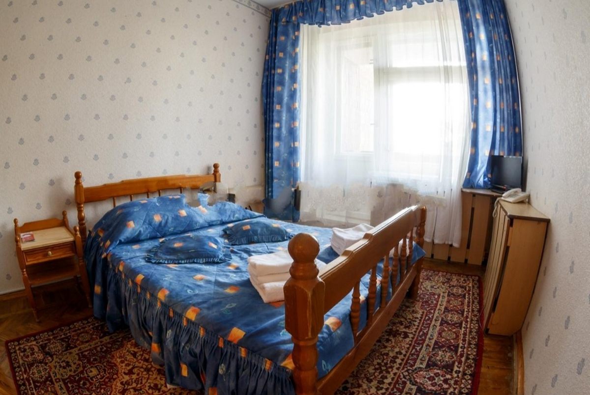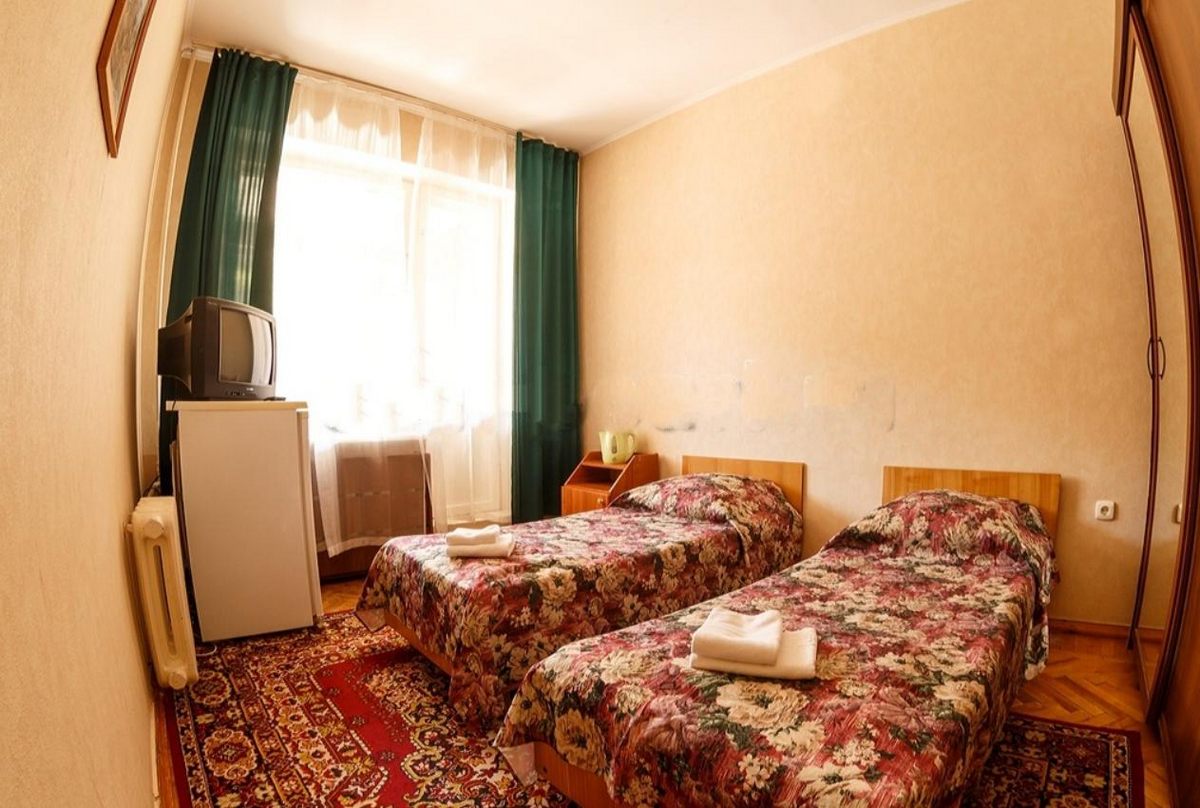 В номере: две односпальные кровати, прикроватные тумбы, шкаф, телевизор, телефон, холодильник, электрический чайник, чайный сервиз
