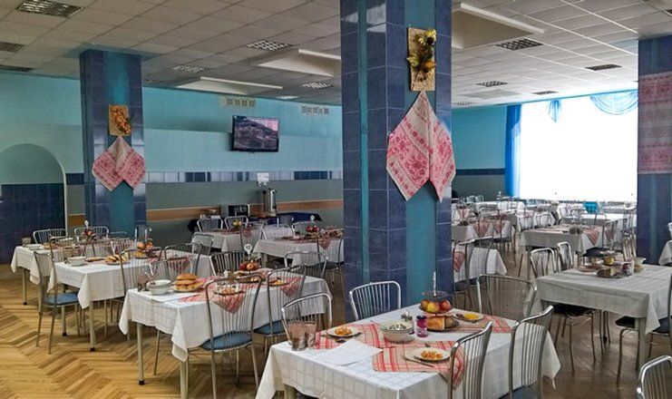 Еврозавтраки - наряду с традиционными блюдами заказного меню разработаны комплексы еврозавтраков на выбор (5 комплексов). Например, один комплекс состоит из колбасы с овощами, омлета, масла, сыра, хлебца. Другой - творог с вареньем, рисовая каша с черносливом, сырокопченая колбаса, масло, сыр, вафли. Так же предлагаются комплексы, включающие бутерброд с колбасой, запеканку манную с яблоком, печенье, либо комплексы из запеченного яблока, сосисок с тушеной капустой, вафли, а так же, например, бутерброда запеченного, отварной рыбы с овощами, фрукта. К каждому комплексу предлагается чай или кофе на выбор. Так же любой отдыхающий может заказать утром к завтраку еще одно полезное и приятное новшество - воду с лимоном.