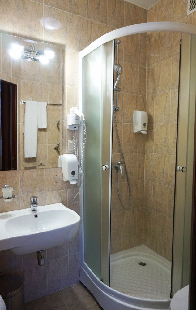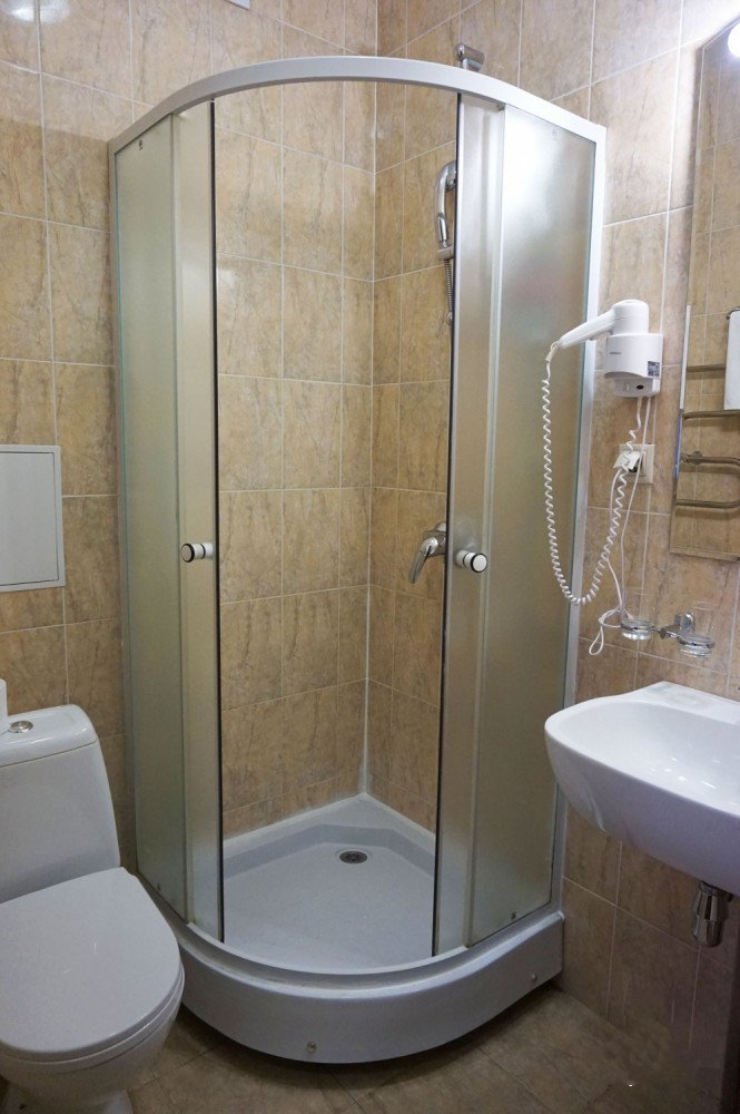 Сан-узел: душевая кабина, умывальник, унитаз, фен.
