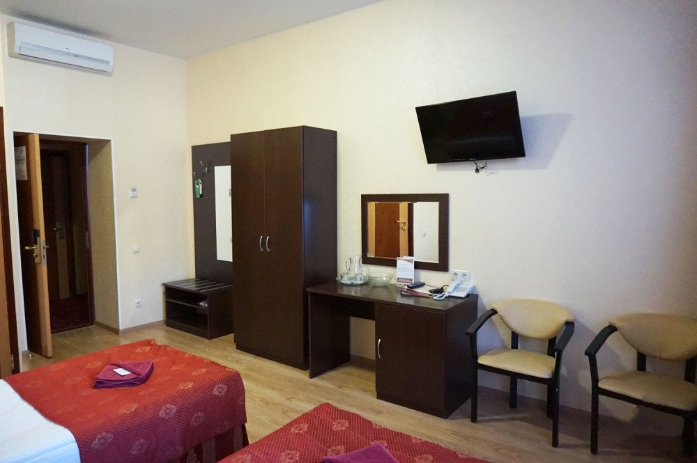В номере: 2-е односпальные кровати или одна большая, холодильник, мини-бар, плоскоэкранный телевизор, мини-сейф, телефон, кондиционер.