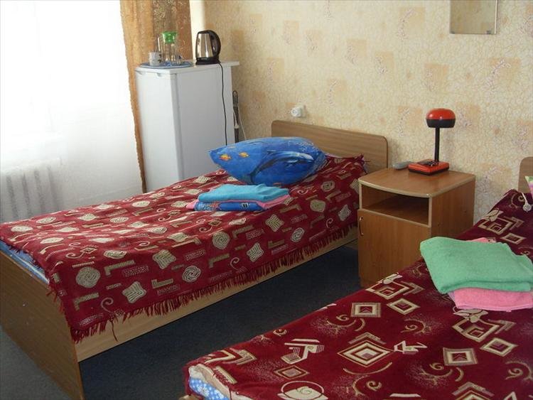 В номере: 2-е кровати, стол, стулья, вешалка, зеркало, ТВ, холодильник.