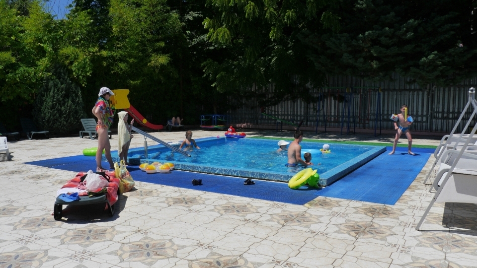 Спорт : открытый взрослый (9*21м) и детский бассейны (6*6м), тренажерный зал, волейбольная площадка, настольный теннис, прокат спортинвентаря, велосипедов, роликов.