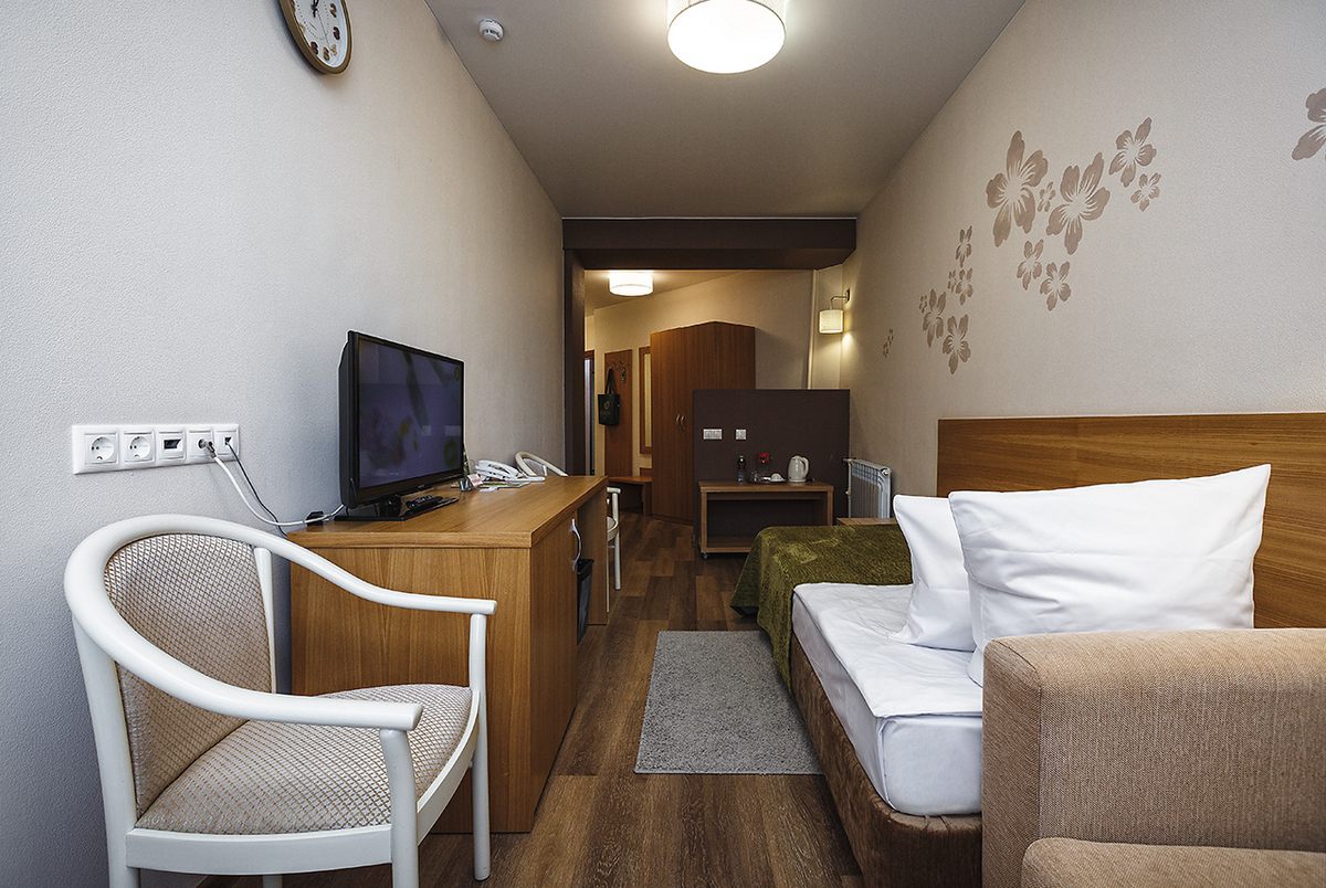 В номере: кровать односпальная, прикроватная тумбочка, стол, шкаф, кресло, телевизор, холодильник, телефон, сушилка для белья