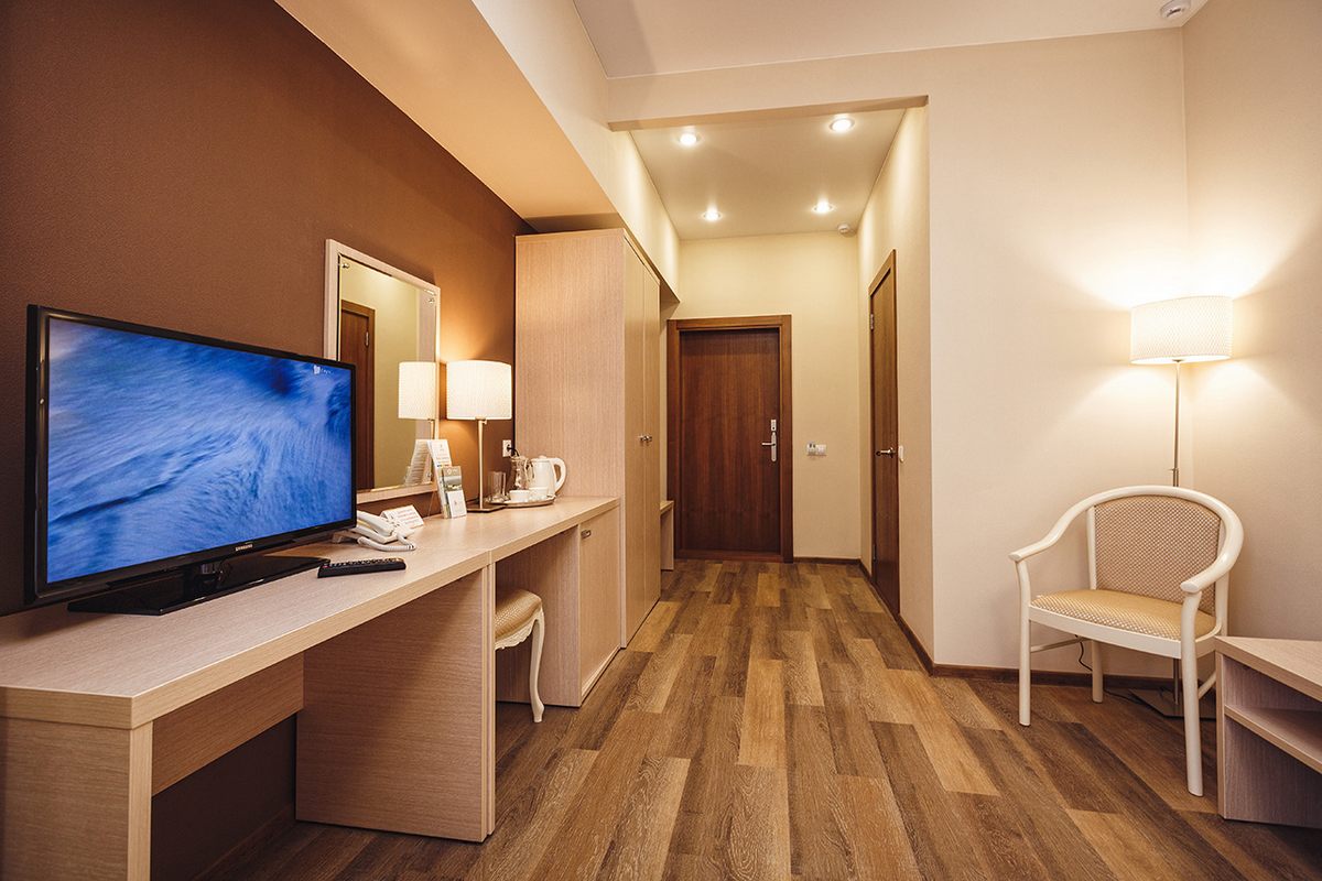 В номере: две односпальные кровати или рдна двуспальная, прикроватные тумбочки, шкаф, столик журнальный, туалетный столик, телевизор, телефон, чайник, холодильник, сушилка для белья
