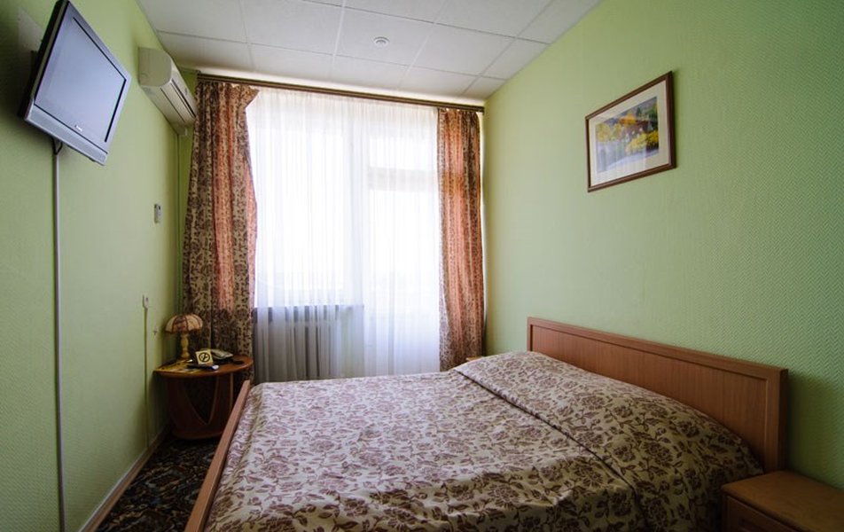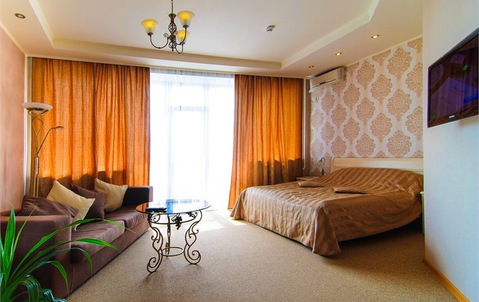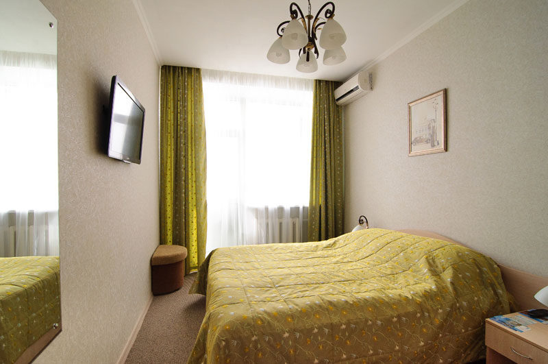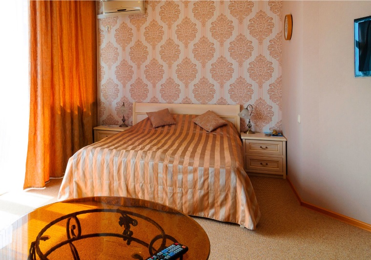 В номере: вешалка, зеркало, кровать двуспальная, прикроватные тумбочки, стол, стулья, шкаф, мини-холодильник, сплит-система, телевизор, телефон, утюг, чайный набор посуды, электрочайник