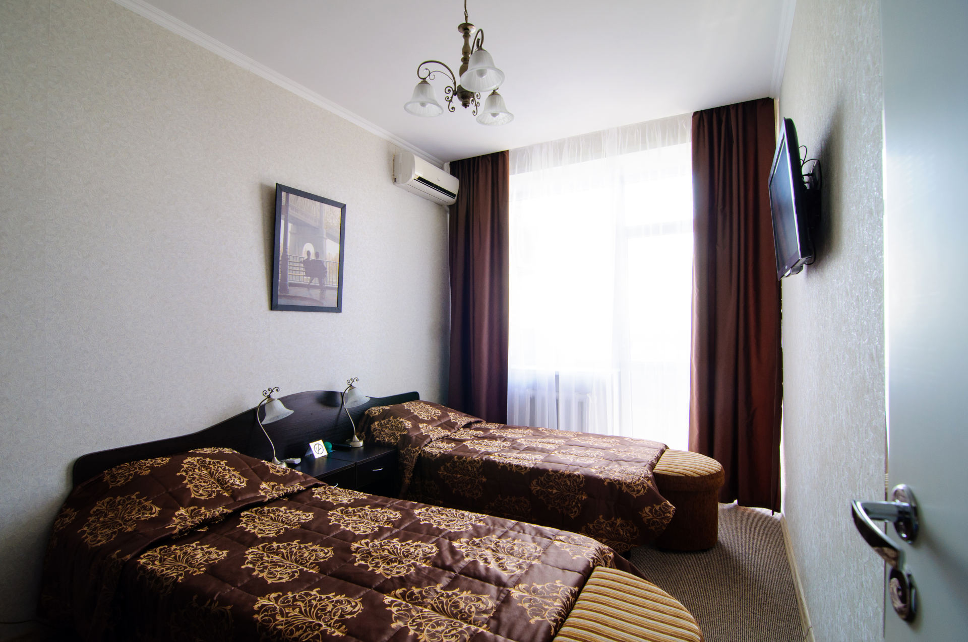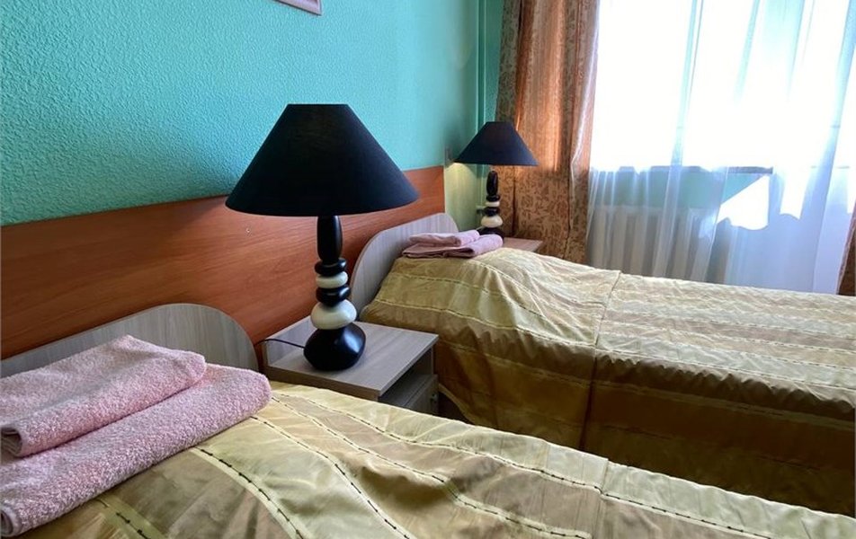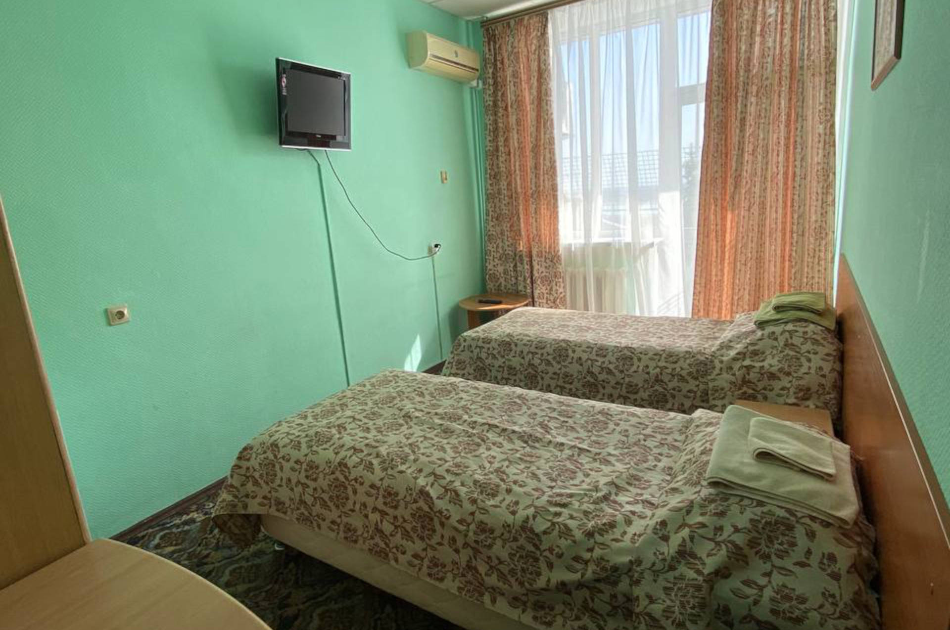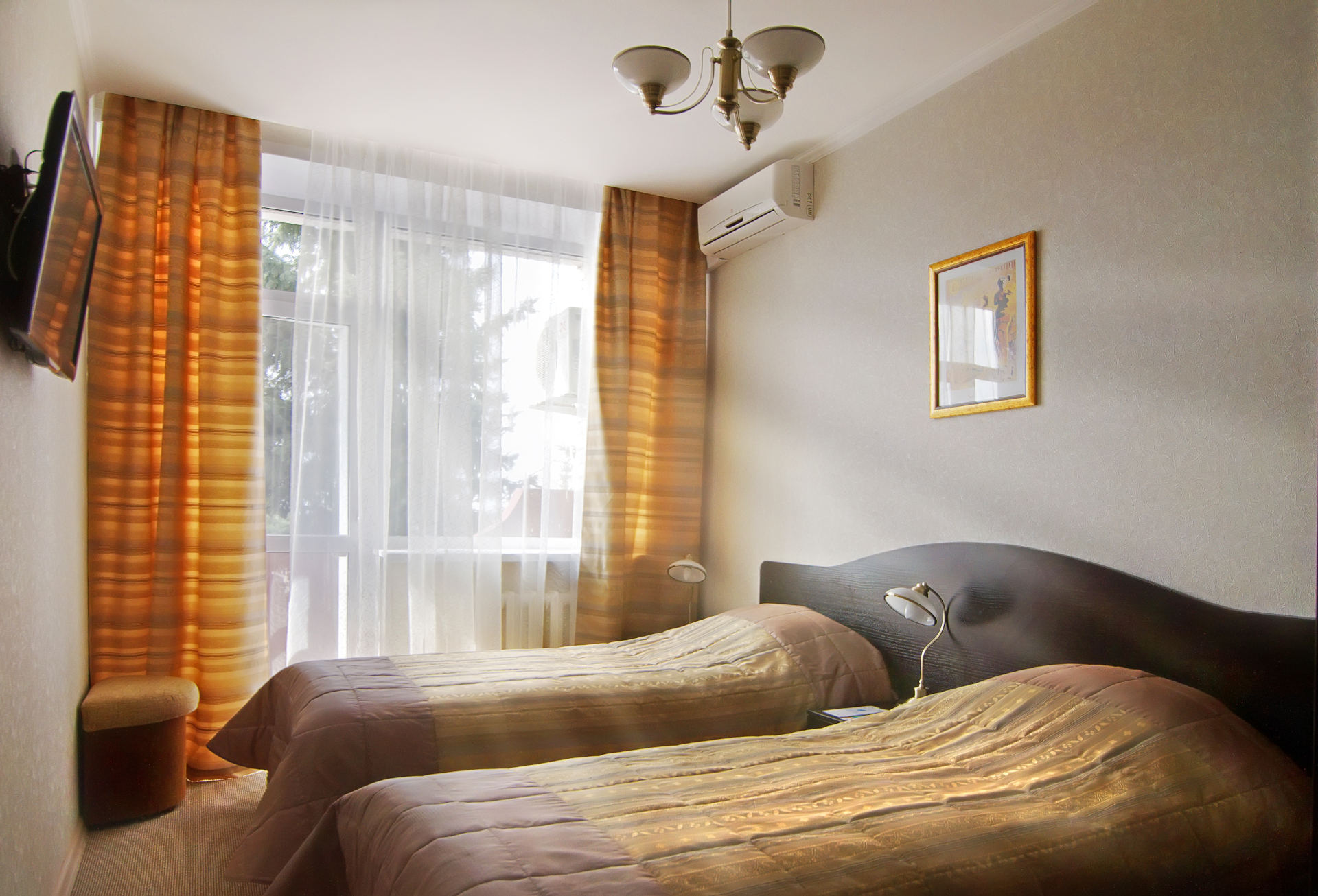 В номере: вешалка, зеркало, две односпальные кровати, прикроватные тумбочки, стол, стулья, шкаф, мини-холодильник, сплит-система, телевизор, телефон, холодильник