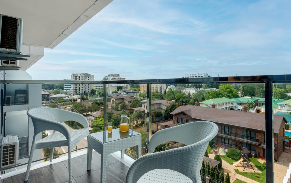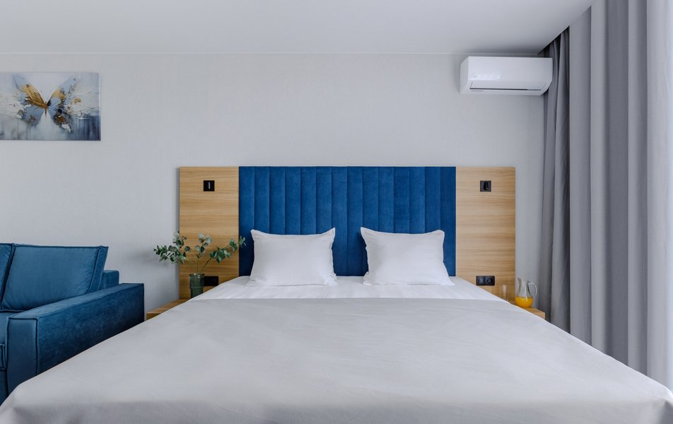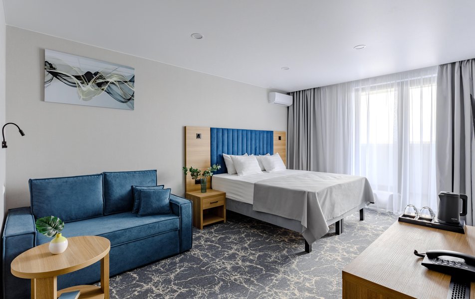 В номере: вешалка, диван, зеркало, двуспальная кровать, прикроватные тумбочки, стол, стулья, шкаф, мини-холодильник, сейф, сплит-система, телевизор, телефон, электрочайник