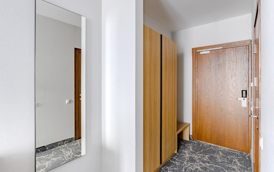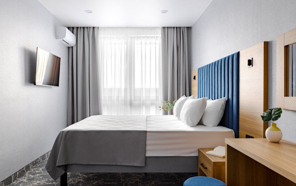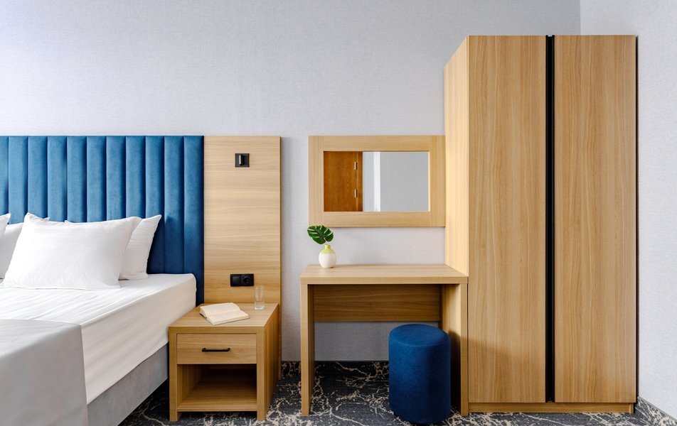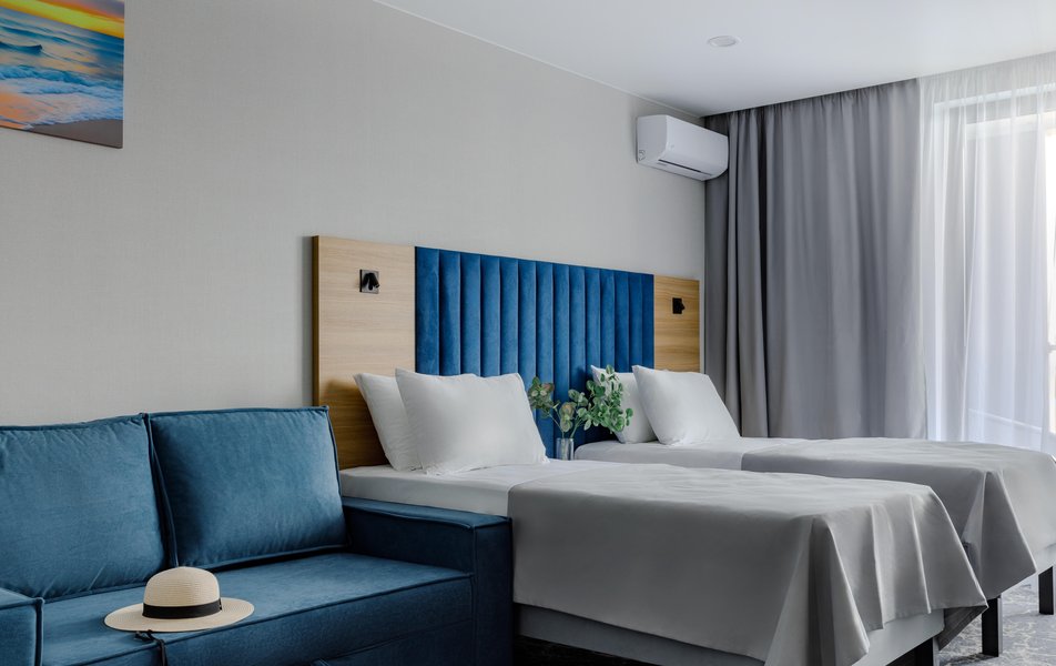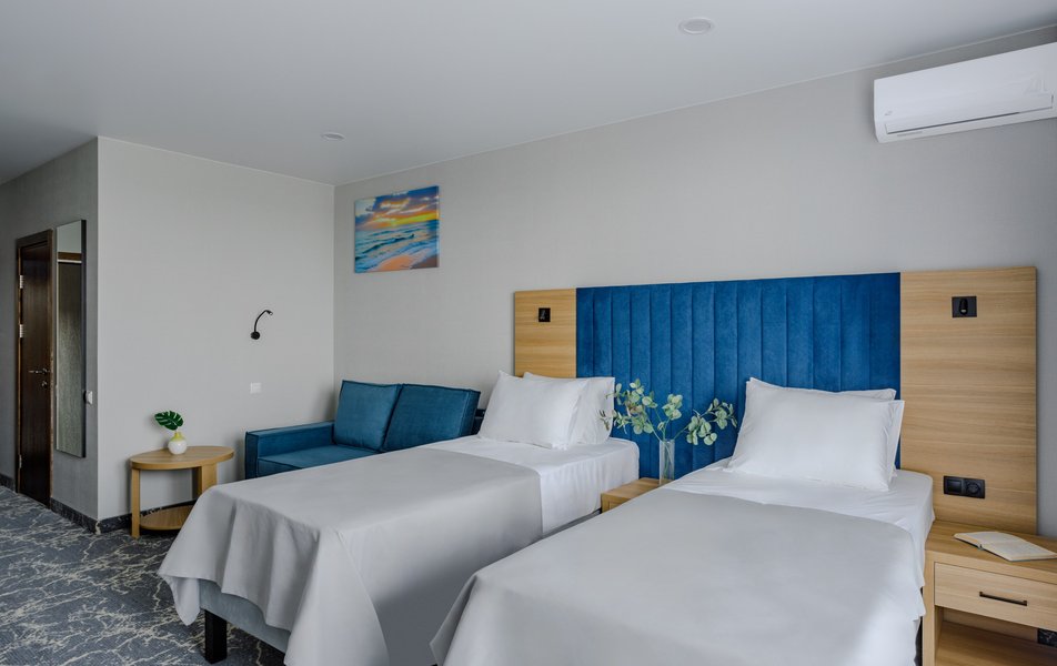 В номере: вешалка, диван, зеркало, кровати односпальные, прикроватные тумбочки, стол, стулья, шкаф, мини-холодильник, сейф, сплит-система, телевизор, телефон, электрочайник