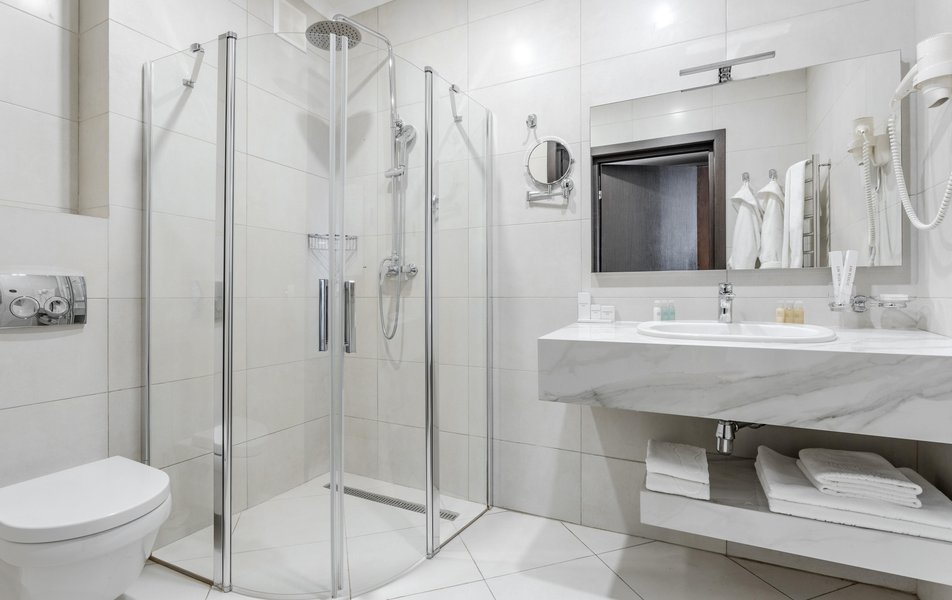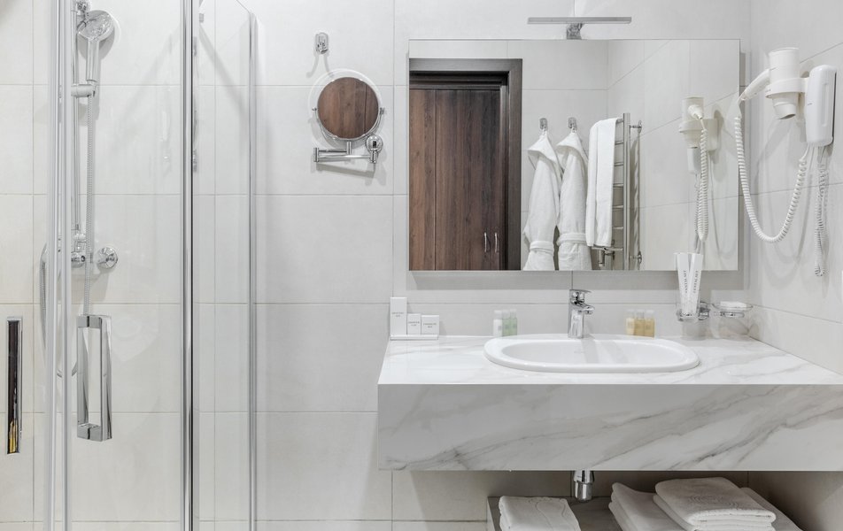 Санузел: душ, раковина, унитаз, тапочки, туалетные принадлежности, фен, халат