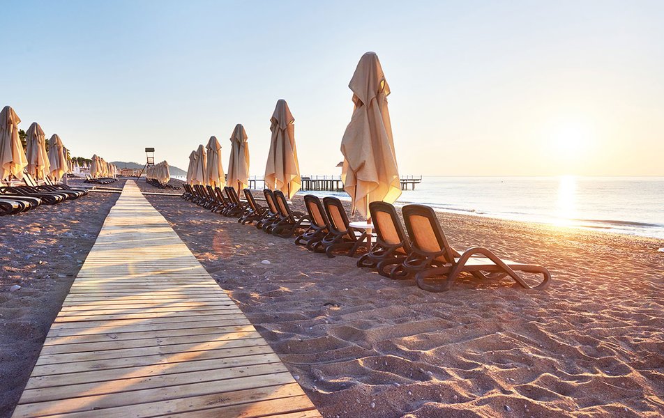 В 600 метрах от отеля находится ухоженный песчаный пляж с мягким входом в море. Здесь доступны лежаки под навесами, душевые, туалеты, раздевалки, питьевая вода, отдельная зона для курящих и деревянные настилы для удобства передвижения. На пляже работают спасатели и медицинский пост