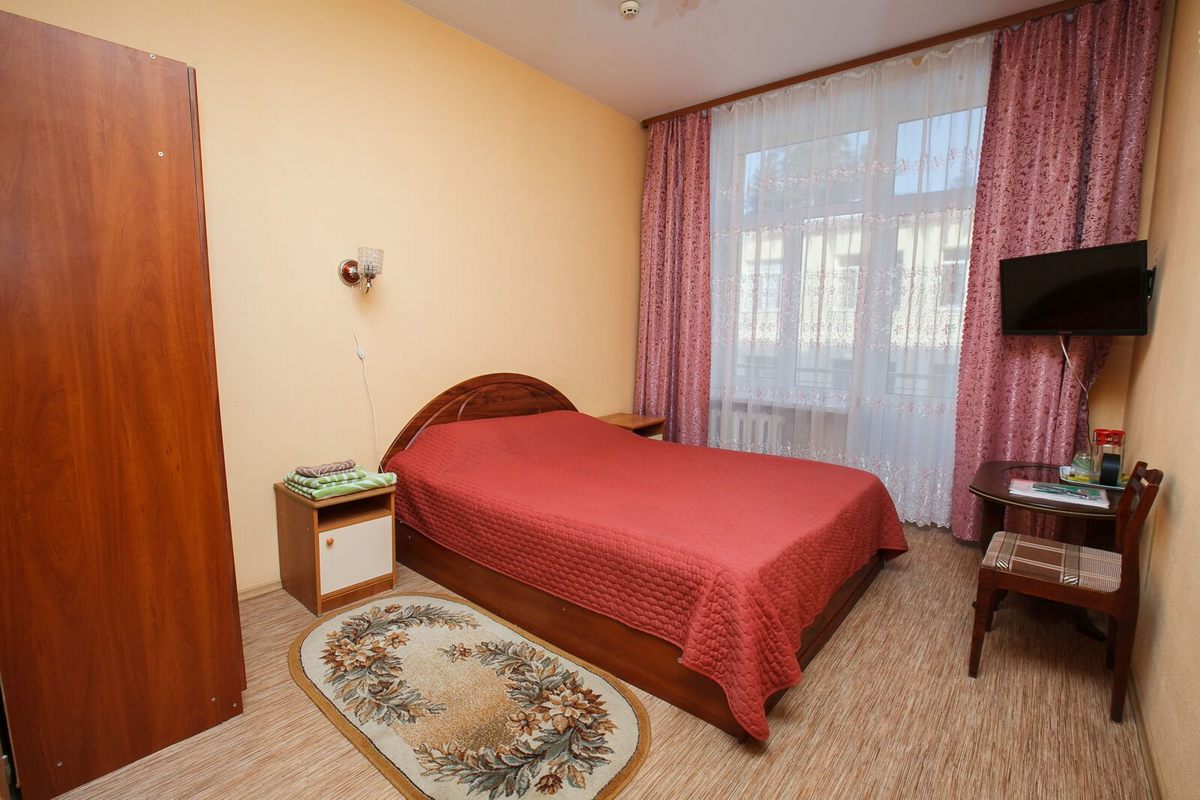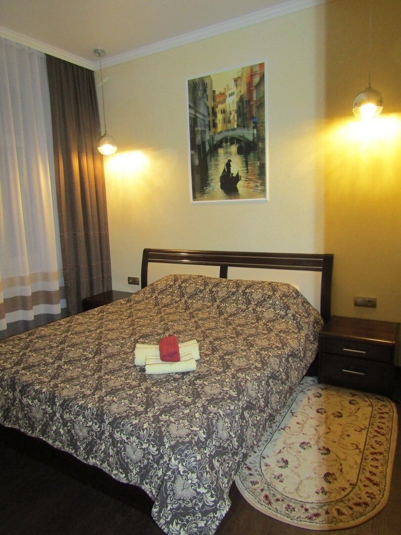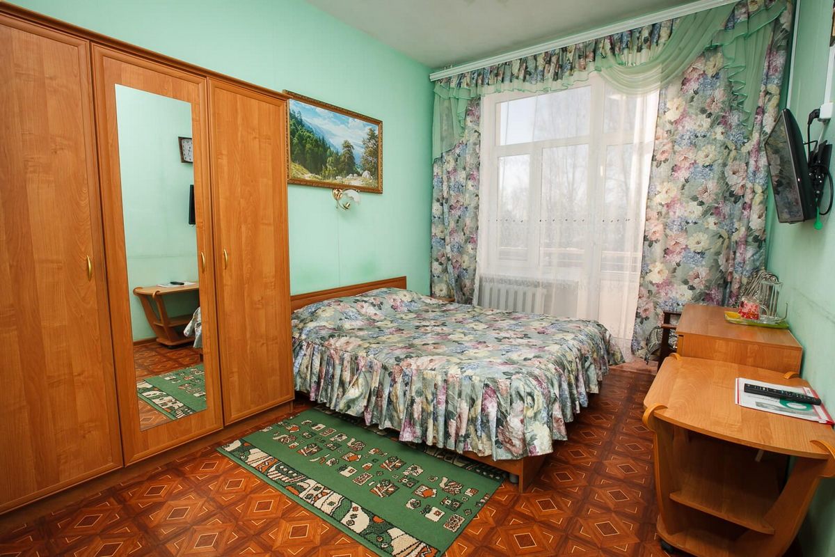 В номере: 2-е односпальные или 1-а двуспальная кровать, телевизор, стол, стулья, прикроватные тумбы, шкаф для одежды. Холодильник в блоке на две комнаты.