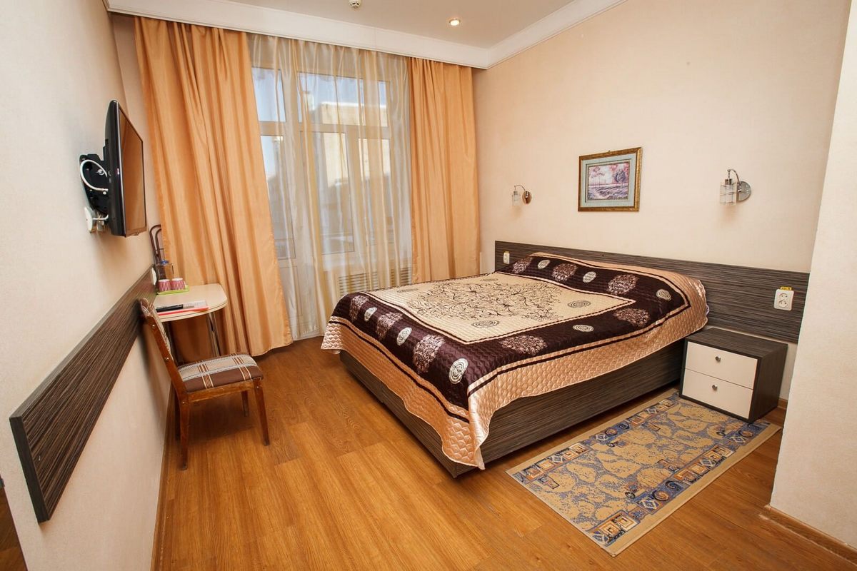 В номере: большая двухспальная кровать или две раздельные, телевизор, стол, стулья, прикроватные тумбы, шкаф для одежды.