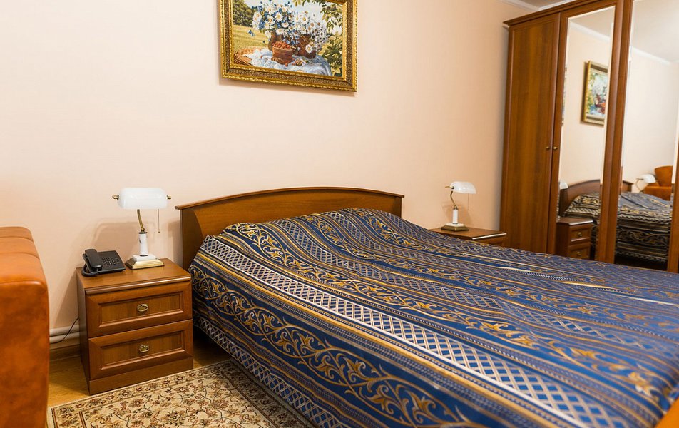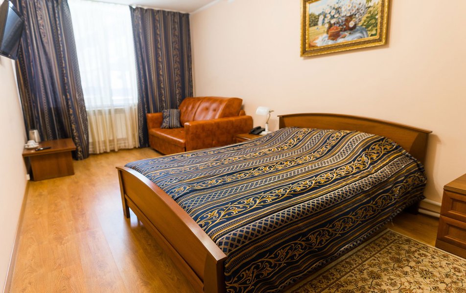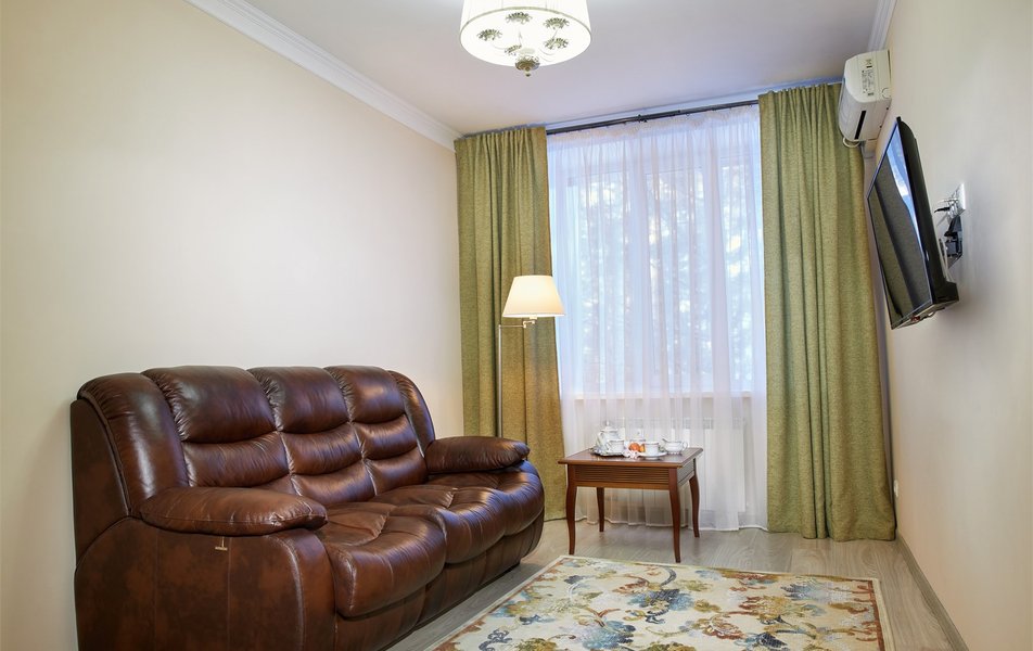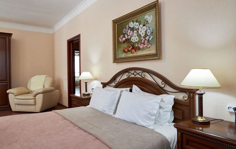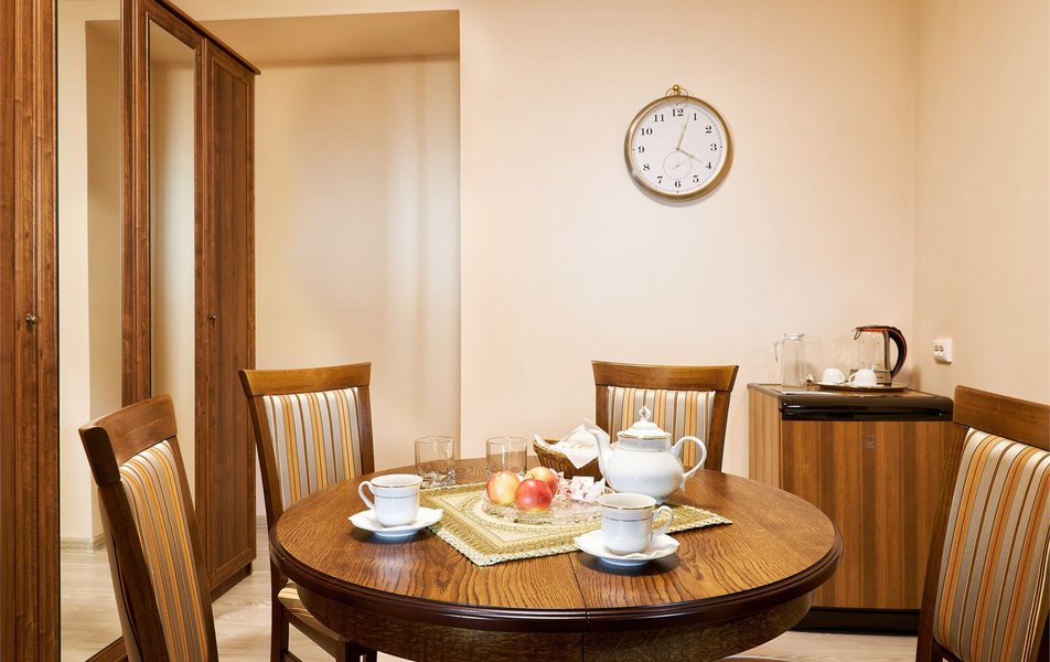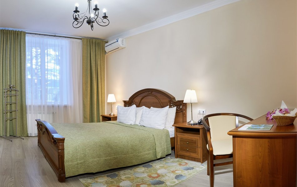 В номере: вешалка, диван, зеркало, кровать двуспальная, прикроватные тумбочки, стол, столик журнальный, стулья, шкаф, сейф, телевизор ЖК, телефон, холодильник, чайный набор посуды, электрочайник