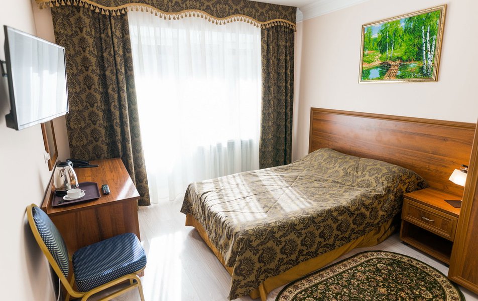 В номере: вешалка, кровать односпальная, прикроватные тумбочки, стол, столик журнальный, стулья, шкаф, сейф, телевизор ЖК, телефон, холодильник, чайный набор посуды, электрочайник