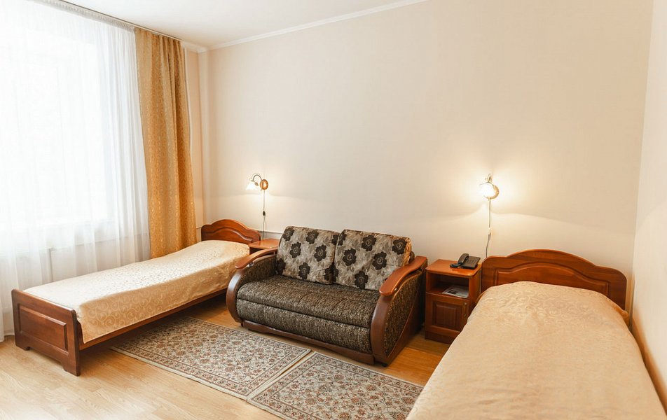 В номере: вешалка, кровати односпальные, прикроватные тумбочки, стол, столик журнальный, стулья, шкаф, сейф, телевизор ЖК, телефон, холодильник, чайный набор посуды, электрочайник