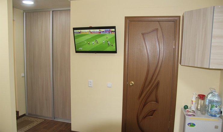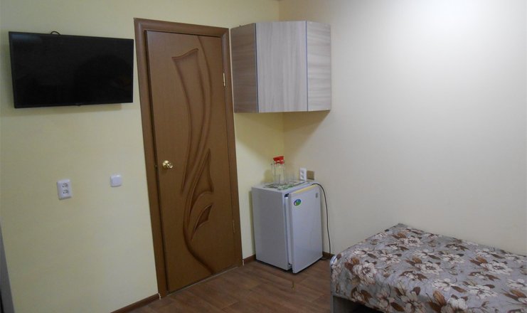 В номере: кровать полутораспальная, прикроватная тумбочка, шкаф, телевизор, холодильник