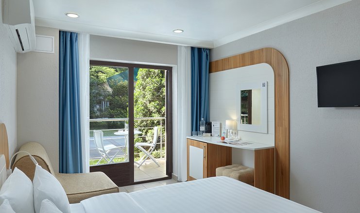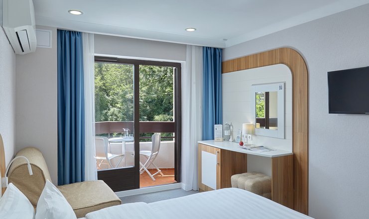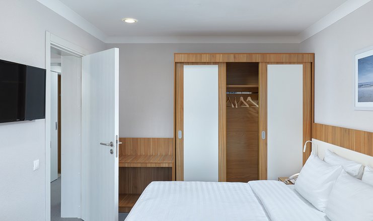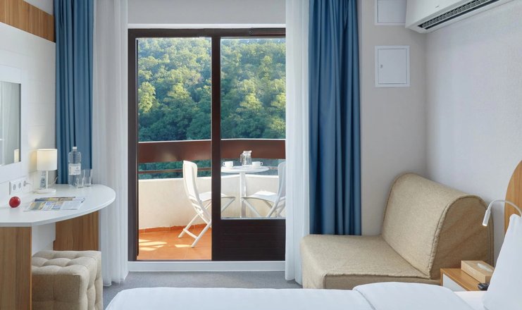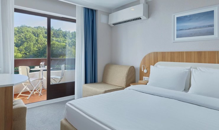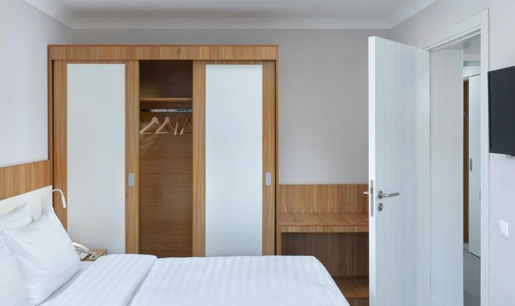 Оснащение номера: кресло-кровать, кровать двуспальная, прикроватные тумбочки, столик туалетный, стул, тумба багажная, шкаф, гладильная доска, мини-холодильник, набор посуды: бутылка с крышкой, 2 стакана, сейф, сплит-система, телевизор, телефон: внутренняя связь, утюг