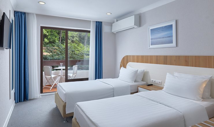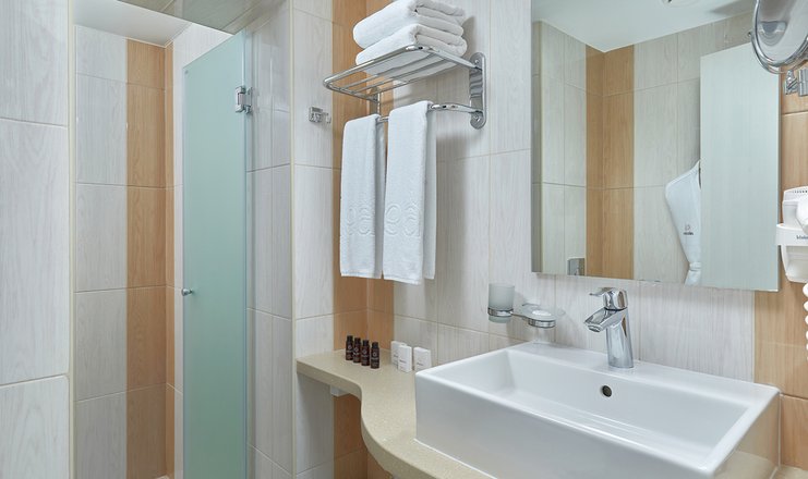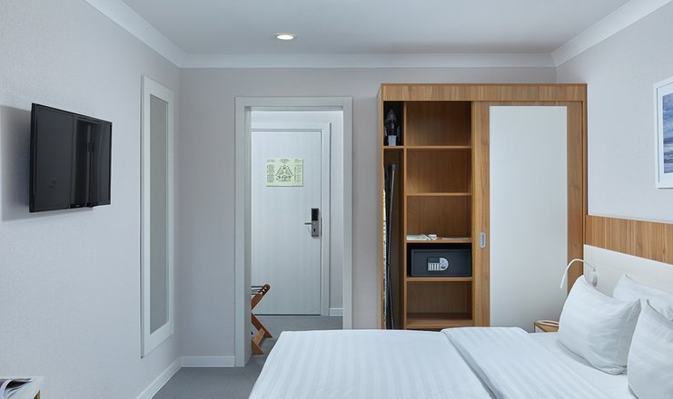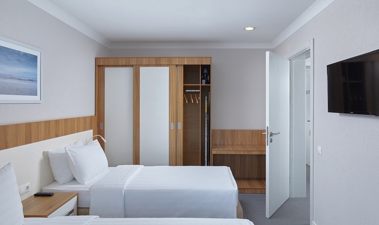 Оснащение номера: зеркало, кровати односпальные /одна двуспальная кровать, прикроватные тумбочки: и лампа настольная, стол, стул, тумба багажная, шкаф-купе, гладильная доска, мини-холодильник, сейф, сплит-система, телевизор ЖК: 32 дюйма, телефон, утюг, чайная станция