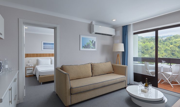 Оснащение номера: кухня, диван, зеркало, комод, кресло-кровать, кровати односпальные /одна двуспальная кровать, прикроватные тумбочки: и настольная лампа, стол, столик журнальный, стул, тумба багажная, шкаф-купе, гладильная доска, микроволновая печь, мини-холодильник, сейф, сплит-система, телевизор ЖК: 32 дюйм, телефон, утюг, чайная станция