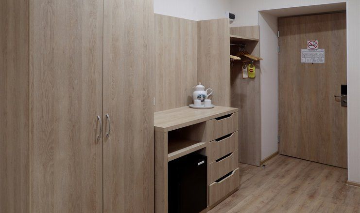 В номере: две односпальные кровати, прикроватные тумбы, журнальный столик, туалетный стол, стулья, шкаф для одежды, телевизор, холодильник