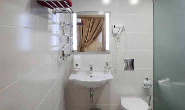 Санузел: душевая кабина или ванна, раковина, унитаз, фен, гигиенические принадлежности