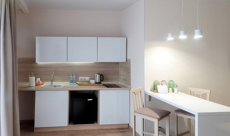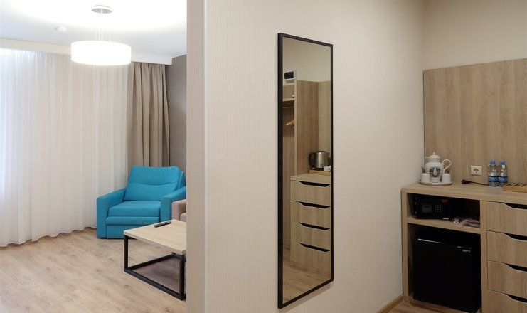 В номере: две комнаты: спальня и гостиная, двуспальная кровать, прикроватные тумбочки, набор мягкой мебели, столик журнальный, стол туалетный, стулья, шкаф для одежды, комод, мини-кухня, холодильник, набор посуды, телевизор, электрический чайник