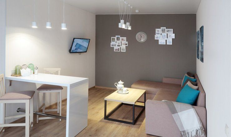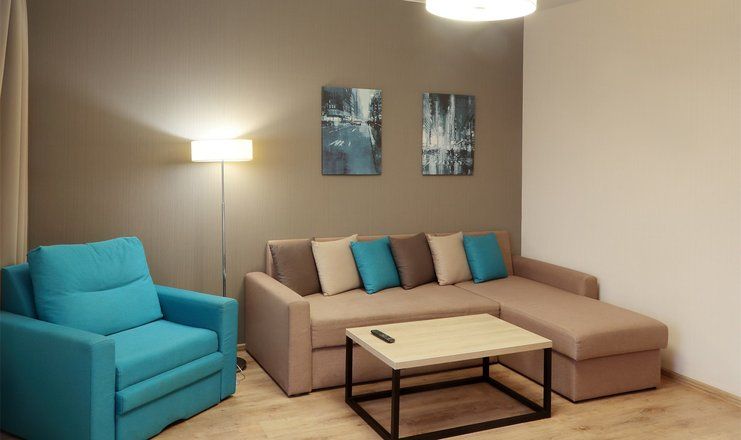 В номере: две односпальные кровати, прикроватные тумбы, журнальный столик, туалетный стол, стулья, шкаф для одежды, диван, телевизор, холодильник
