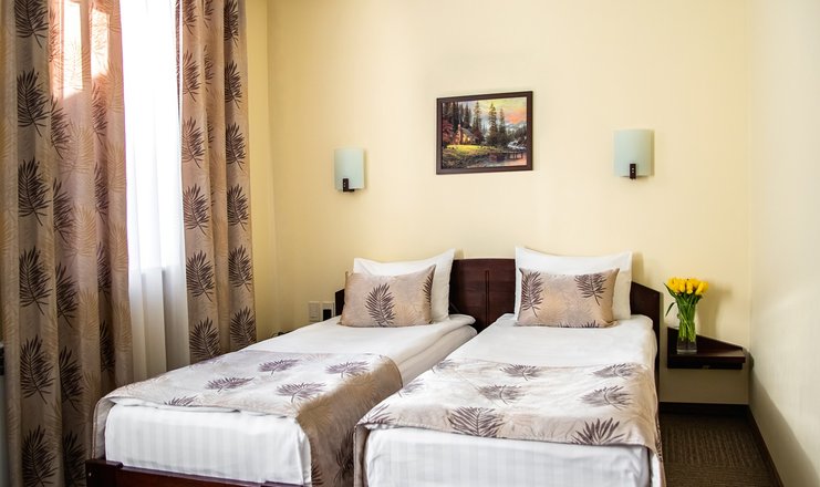 В номере: вешалка, кровати односпальные, прикроватные тумбочки, стол, стулья, шкаф, телевизор, телевизор ЖК, холодильник, чайный набор посуды, электрочайник