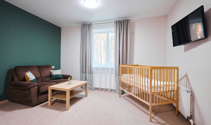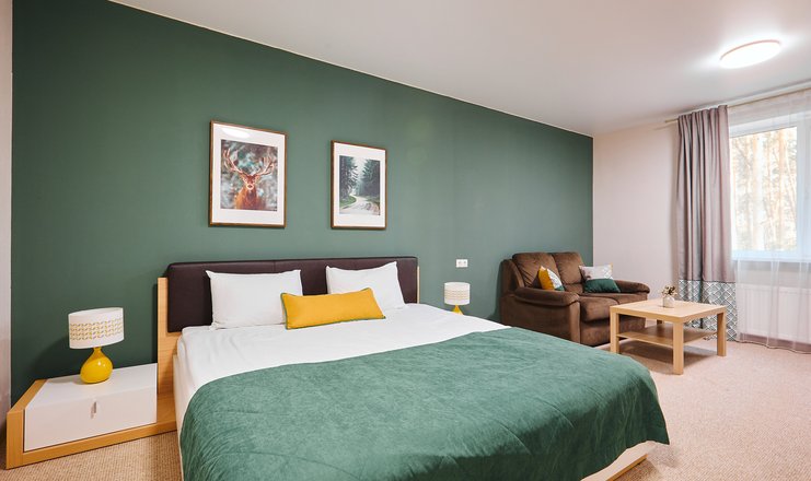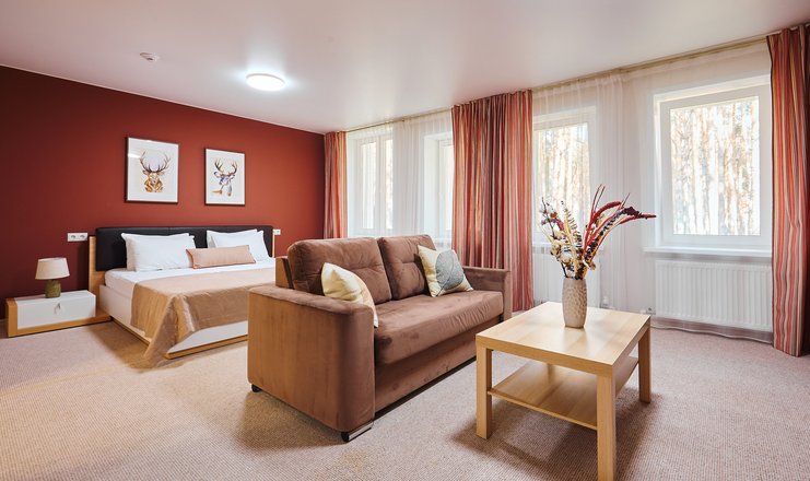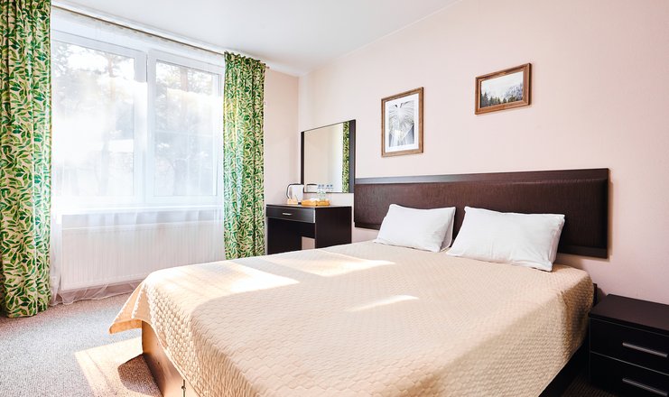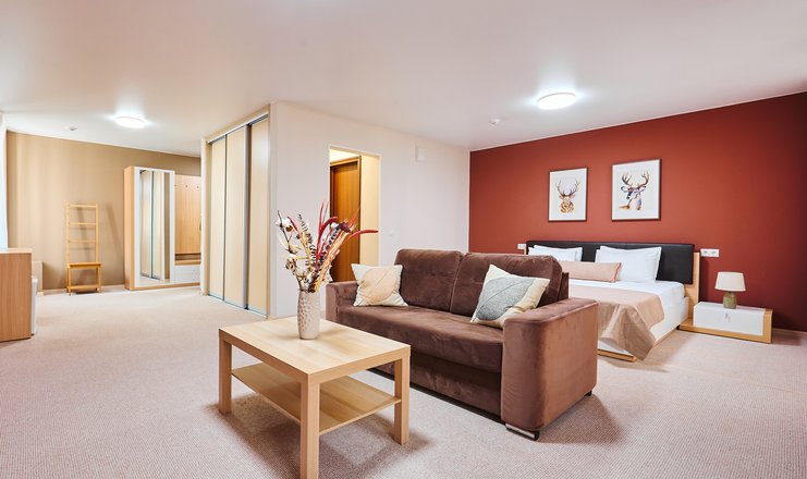 В номере: вешалка, диван раскладной, зеркало, кровать двуспальная, прикроватные тумбочки, столик журнальный, столик туалетный, стул, шкаф, мини-холодильник, телевизор ЖК, телефон, чайный набор посуды, электрочайник