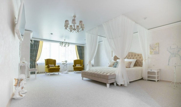 В номере: вешалка, зеркало, кресла, кровать двуспальная, прикроватные тумбочки, столик журнальный, столик туалетный, шкаф, мини-холодильник, телевизор ЖК, телефон, чайный набор посуды, электрочайник